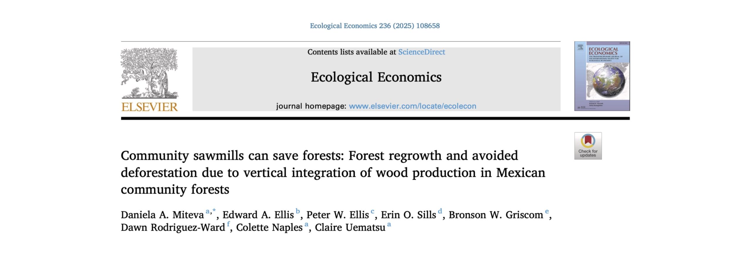 27/05/2025, Xalapa, Ver., El Dr. Eddie Ellis, investigador del Centro de Investigaciones Tropicales (CITRO) de la Universidad Veracruzana, participa como segundo autor en un importante artículo recientemente publicado en la revista Ecological Economics titulado: “Community sawmills can save forests: Forest regrowth and avoided deforestation due to vertical integration of wood production in Mexican community forests”. En colaboración con colegas de The Ohio State University, North Carolina State University, The Nature Conservancy y Conservation International, este estudio emplea métodos estadísticos de vanguardia y datos espaciales detallados para demostrar cómo la integración vertical en ejidos forestales, es decir, la construcción y operación de aserraderos comunitarios, contribuye significativamente a reducir la deforestación y promover la regeneración forestal en el estado de Quintana Roo, México. Mediante un análisis con datos de panel espacialmente explícito de 224 ejidos entre 1996 y 2008, los autores encontraron que la presencia de aserraderos comunitarios está asociada con una disminución del 3.6% en la pérdida de cobertura forestal y un incremento del 0.3% en la regeneración, comparado con ejidos sin aserraderos o sin integración vertical.