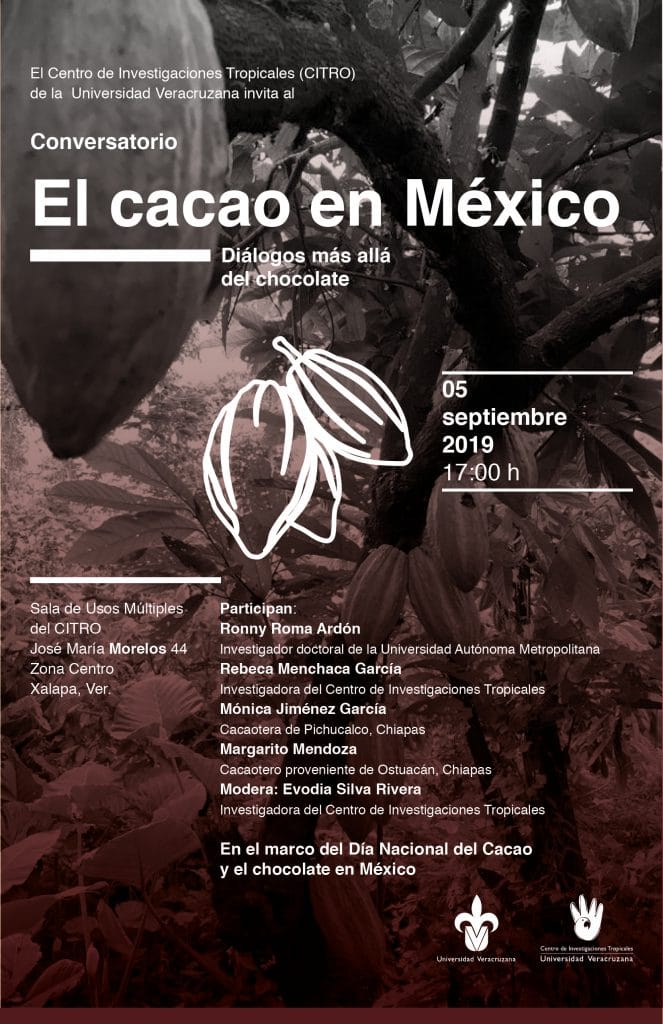 30/08/19, Xalapa, Ver. El Congreso de la Unión instauró el 2 de septiembre como el Día Nacional del Cacao y el chocolate en México. Como parte de las actividades para divulgar la importancia del cacao mexicano y los problemas que enfrenta para su cultivo, producción y comercialización, el Centro de Investigaciones Tropicales organiza el conversatorio “El cacao en México. Diálogos más allá del chocolate” a realizarse el 5 de septiembre de 2019, a las 17:00 hrs.