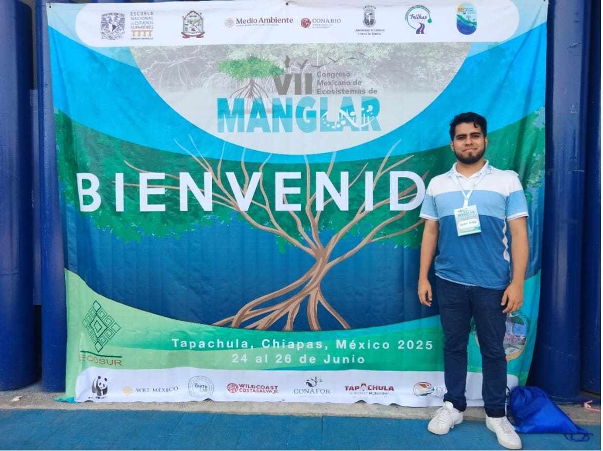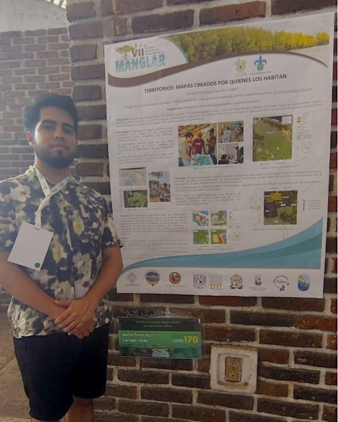 08/07/2025, Xalapa, Ver. Con la ponencia titulada «Conocimiento sobre el territorio y las especies de mangle en el Sistema Lagunar de Alvarado», el estudiante de Doctorado en Ecología Tropical, Jaime Francisco Camelo-Vidal, participó en el VII Congreso Mexicano de Ecosistemas de Manglar, celebrado del 24 al 26 de junio de 2025 en Tapachula, Chiapas, donde expuso los resultados de su investigación de maestría en una ponencia oral sobre cómo las comunidades locales perciben, utilizan, territorializan y transmiten el conocimiento relacionado con el ecosistema de manglar, así como los retos que enfrentan ante las transformaciones ecológicas y normativas vigentes. Asimismo, durante el evento el alumno presentó, en formato de cartel, la reflexión titulada «Territorios y manglar: Mapas creados por quienes los habitan», centrada en la implementación de la cartografía participativa como una metodología que debe adaptarse al contexto y saberes de los hacedores del conocimiento local. Este cartel fue galardonado con el primer lugar del congreso, lo que destaca la calidad y pertinencia de su trabajo tanto en contenido como en forma de presentación.