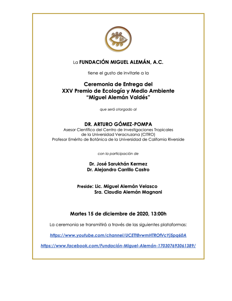 11/12/2020, Xalapa, El Dr. Arturo Gómez Pompa, Asesor Científico del Centro de Investigaciones Tropicales (CITRO) y Profesor Emérito de Botánica de la Universidad de California Riverside, ha sido distinguido por la FUNDACIÓN MIGUEL ALEMÁN, A.C. con el Premio de Ecología y Medio Ambiente en su XXV edición por sus destacadas contribuciones a la investigación en ecología tropical y a la conservación biológica.