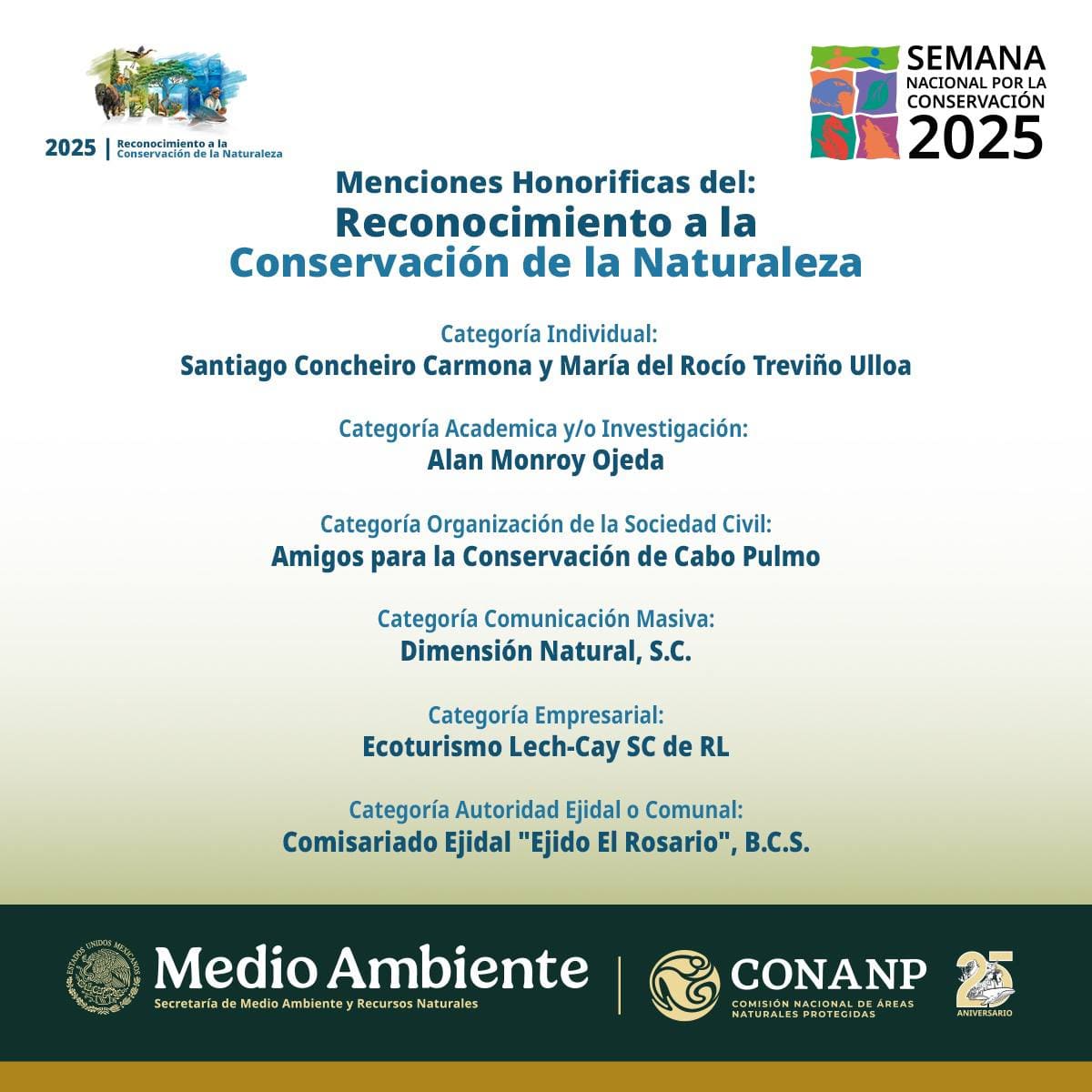 31/10/2025, Xalapa, Ver., La Secretaría de Medio Ambiente y Recursos Naturales (Semarnat), a través de la Comisión Nacional de Áreas Naturales Protegidas (Conanp), cada año emite una convocatoria para obtener el Reconocimiento a la Conservación de la Naturaleza 2025. El objetivo es promover la participación de la sociedad por medio de mecanismos adecuados, que permitan difundir las acciones u obras relevantes que se hayan realizado en beneficio de la conservación del medio ambiente, tales como preservar, ejecutar, evaluar y vigilar la conservación de los recursos naturales, así como su desarrollo sustentable, la recuperación de los ecosistemas y su biodiversidad, la protección de especies en riesgo, y que hayan realizado acciones u obras relevantes, en beneficio de la conservación de la naturaleza por medio de proyectos en las ANP federales establecidas por decreto o Certificado como lo son las Áreas Destinadas Voluntariamente a la Conservación (ADVC) o las zonas de influencia de dichas áreas.