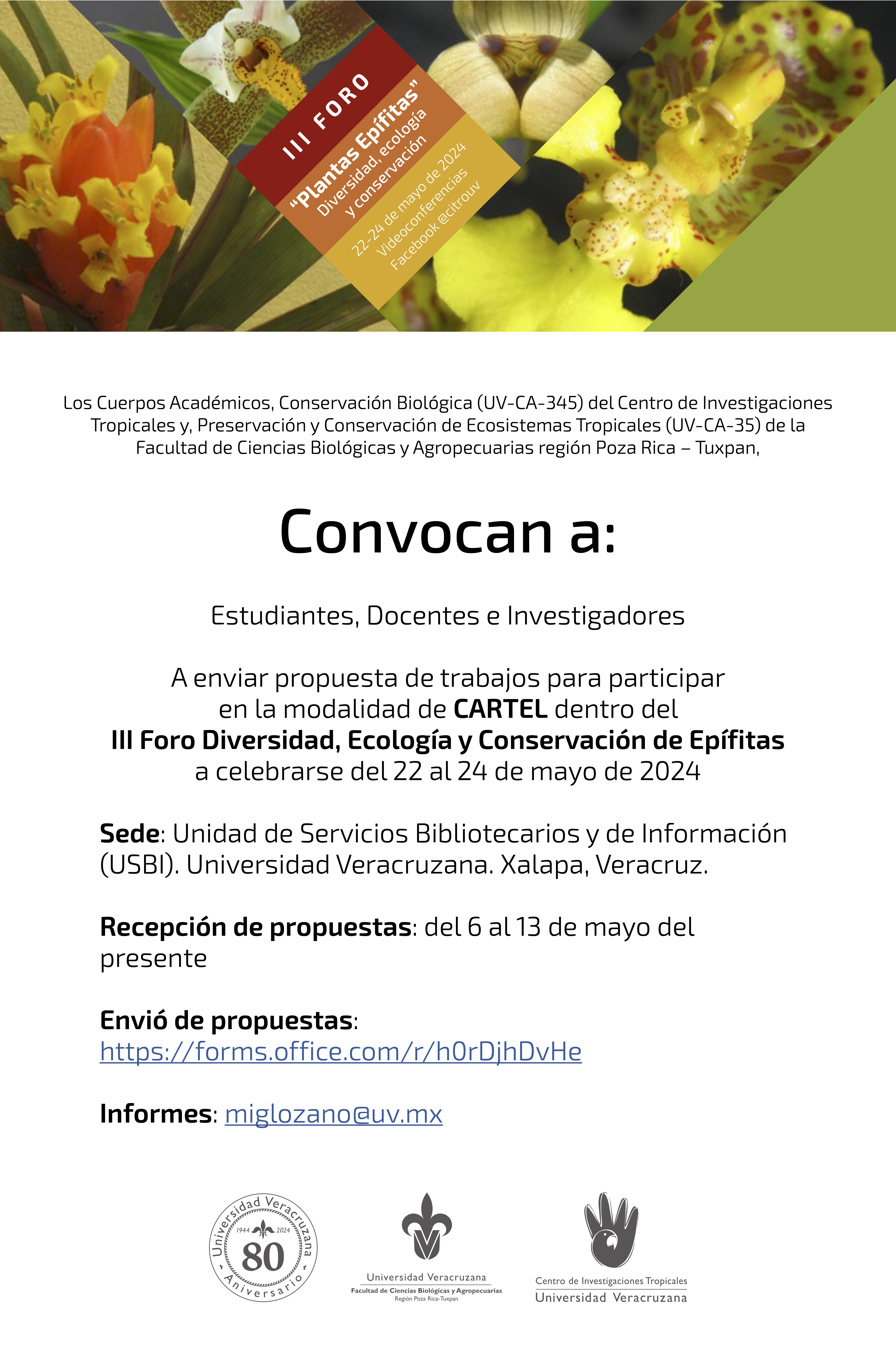 06/05/2024, Xalapa, Ver., El Cuerpo Académico “Conservación Biológica” del Centro de Investigaciones Tropicales y el Cuerpo Académico “Preservación y Conservación de Ecosistemas Tropicales” de la Facultad de Ciencias Biológicas y Agropecuarias de Poza Rica-Tuxpan UV, te invitan a participar en el III Foro sobre Diversidad y Conservación de Plantas Epífitas. Este evento se llevará a cabo del 22 al 24 de mayo en Sala de Videoconferencias de la Unidad de Servicios Bibliotecarios y de Información (USBI), en el Orquidario UV Centro de Investigaciones Tropicales y de manera virtual. No te lo pierdas! Consulta el programa aquí