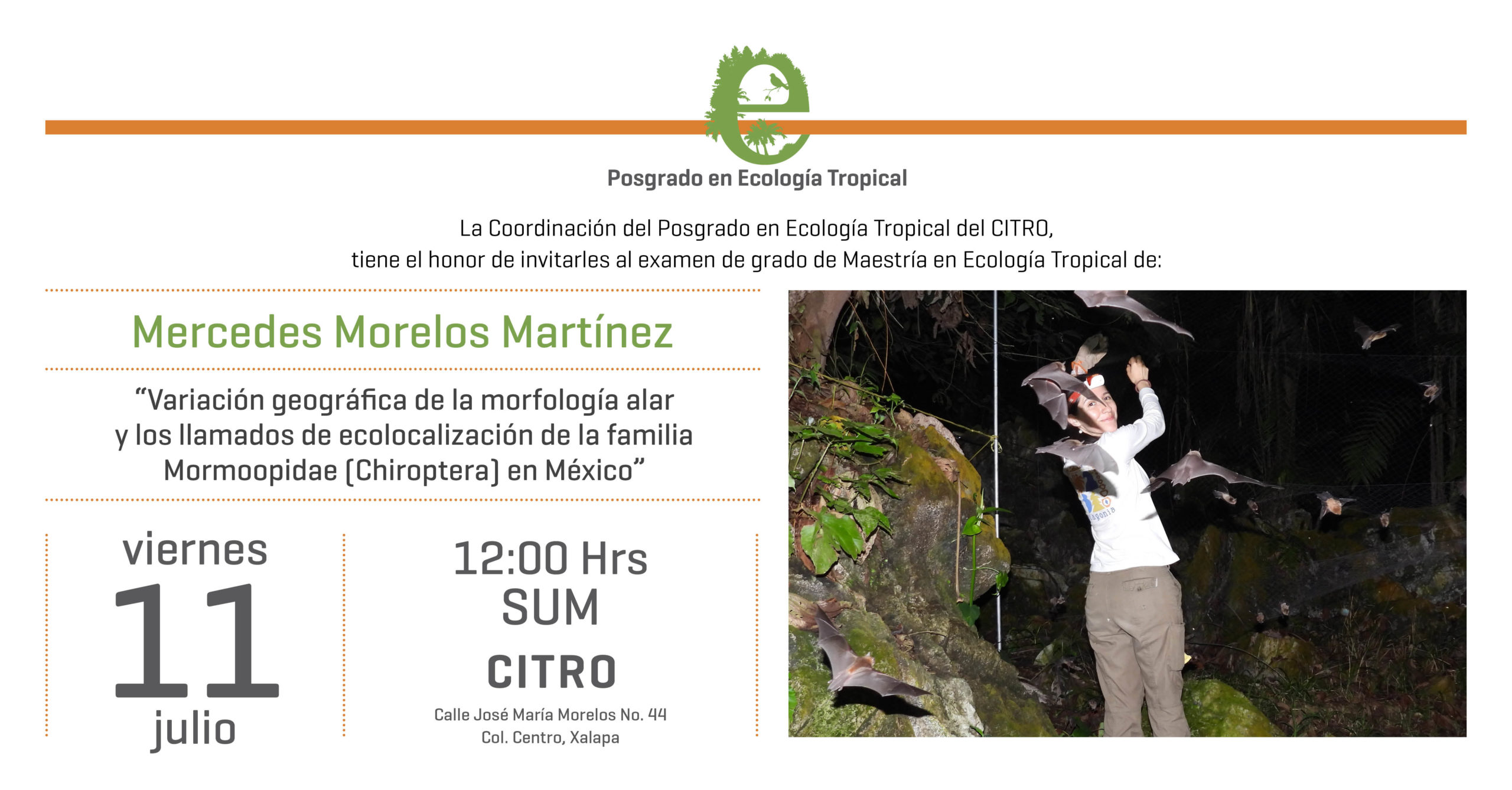 08/07/2025, Xalapa, Ver. El Posgrado en Ecología Tropical del Centro de Investigaciones Tropicales tiene el honor de invitar a la comunidad académica y estudiantil a la defensa del examen de titulación del grado de Maestría en Ecología Tropical de Mercedes Morelos Martínez que defenderá la tesis titulada ‟Variación geográfica de la morfología alar y los llamados de ecolocalización de la familia Mormoopidae (Chiroptera) en México.” el viernes 11 de julio 2025 a las 12:00 hrs en SUM del Centro de Investigaciones Tropicales.