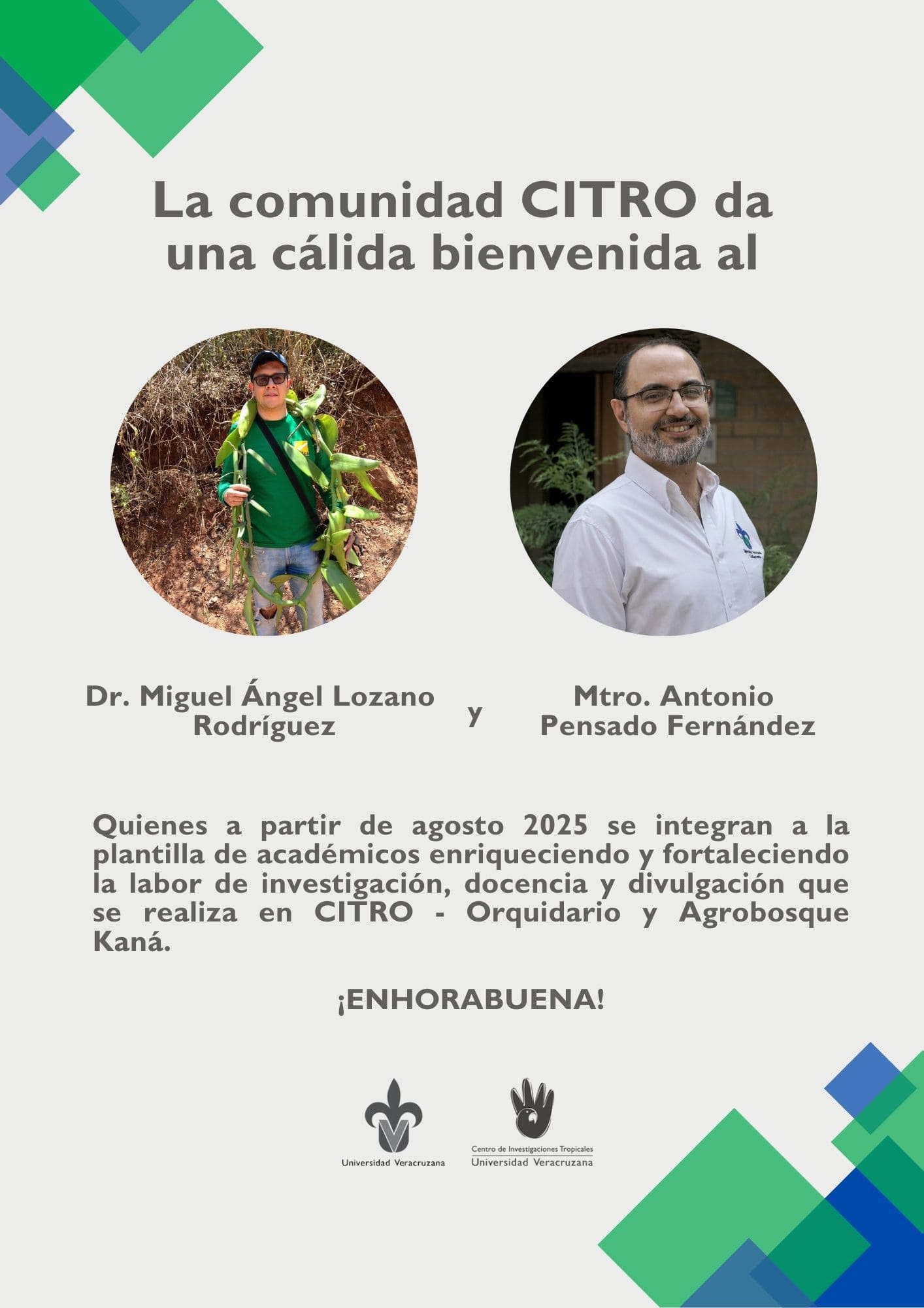 19/08/2025, Xalapa, Ver., Se invita a la bienvenida y presentación del Dr. Miguel Ángel Lozano Rodríguez y Mtro. Antonio Pensado Fernández el día viernes 22 de agosto de 2025 a las 13:00 pm en el Salón de Usos Múltiples del Centro de Investigaciones Tropicales.