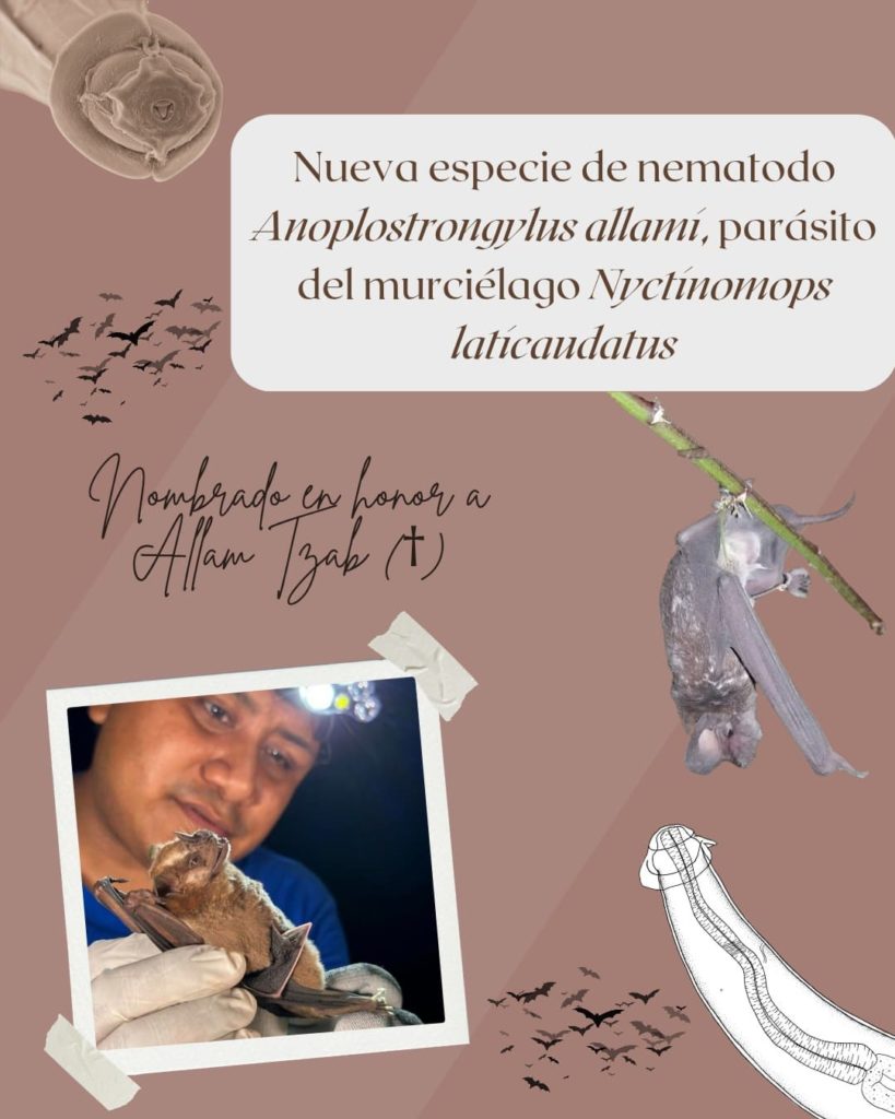 Mediante técnicas de observación al microscopio y análisis genético, se identificaron 17 tipos de helmintos, entre ellos tremátodos, céstodos, nemátodos y acantocéfalos. Destaca el hallazgo de una nueva especie de nemátodo, Anoplostrongylus allami, que mostró ser el parásito más común y abundante en los murciélagos estudiados. La especie fue nombrada en honor al especialista en murciélagos Allam Tzab, quien colaboró en la recolección de muestras en Homún, Yucatán, México, donde se realizó el hallazgo y que falleció en 2024. El trabajo aporta siete nuevos registros de helmintos asociados a N. laticaudatus y cuatro registros inéditos para México, lo que amplía de manera importante el conocimiento sobre la fauna parasitaria de este murciélago y resalta la riqueza biológica poco conocida de la región.