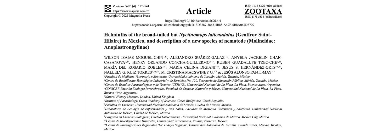 03/10/25, Xalapa, Ver., La investigadora María Cristina Mac Swiney González, investigadora del Centro de Investigaciones Tropicales de la Universidad Veracruzana publicó recientemente un artículo científico en la revista Zootaxa. El artículo versa sobre los endoparásitos del murciélago del murciélago Nyctinomops laticaudatus, especie insectívora que habita desde México hasta el norte de Argentina. En esta investigación, realizada en los municipios de Calcehtok y Homún (Yucatán, México), se analizó la diversidad de helmintos (gusanos parásitos) presentes en esta especie. Este artículo es resultado del estudio doctoral de Wilson Moguel Chin, estudiante de la Universidad Autónoma de Yucatán y que dirigen el Dr. Alonso Panti May y la Dra. Mac Swiney y en el que participan investigadores de la UADY, la UNAM y colegas de Argentina, República Checa y Reino Unido.