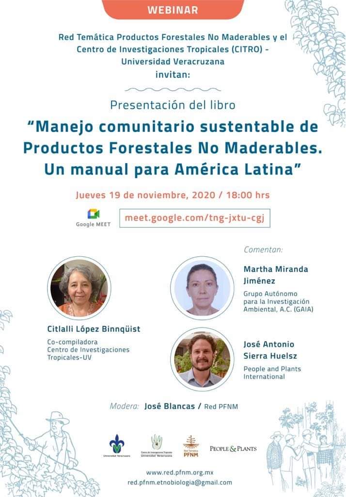 12/11/2020, Xalapa, Ver.- La Red Temática Productos Forestales No Maderables: aportes desde la etnobiología para su aprovechamiento sostenible (Red-PFNM) y el Centro de Investigaciones Tropicales de la Universidad Veracruzana invitan a todo el público interesado a la presentación virtual del del libro “Manejo comunitario sustentable de Productos Forestales No Maderables. Un manual para América Latina”, coordinado por Mary Stockdale y Citlalli López Binnqüist. A llevarse a cabo el día jueves 19 de noviembre de 2020 a las 18:00 horas por http://meet.google.com/tng-jxtu-cgj