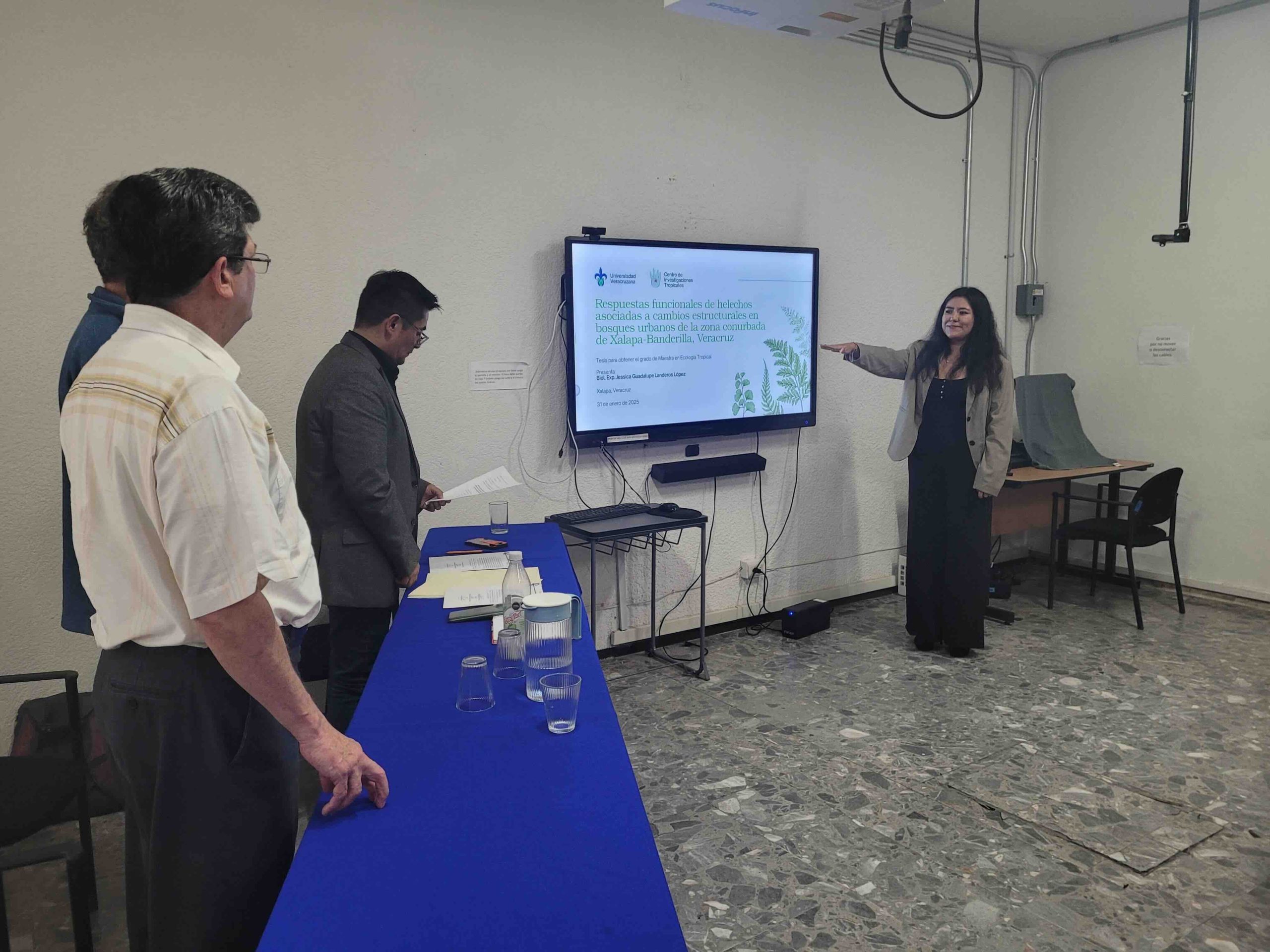 10/02/2025, Xalapa, Ver., El 31 de enero de 2025, Jessica Guadalupe Landeros López obtuvo el grado de Maestra en Ecología Tropical tras presentar su examen de titulación en la sala de usos múltiples del Centro de Investigaciones Tropicales. Su tesis, titulada “Respuestas funcionales de helechos asociadas a cambios estructurales en bosques urbanos de la zona conurbada Xalapa-Banderilla, Veracruz”, analizó cómo la variación en la estructura de la vegetación influye en las condiciones microclimáticas y la morfología de los helechos en cuatro bosques urbanos de la región de Xalapa, Veracruz, México.