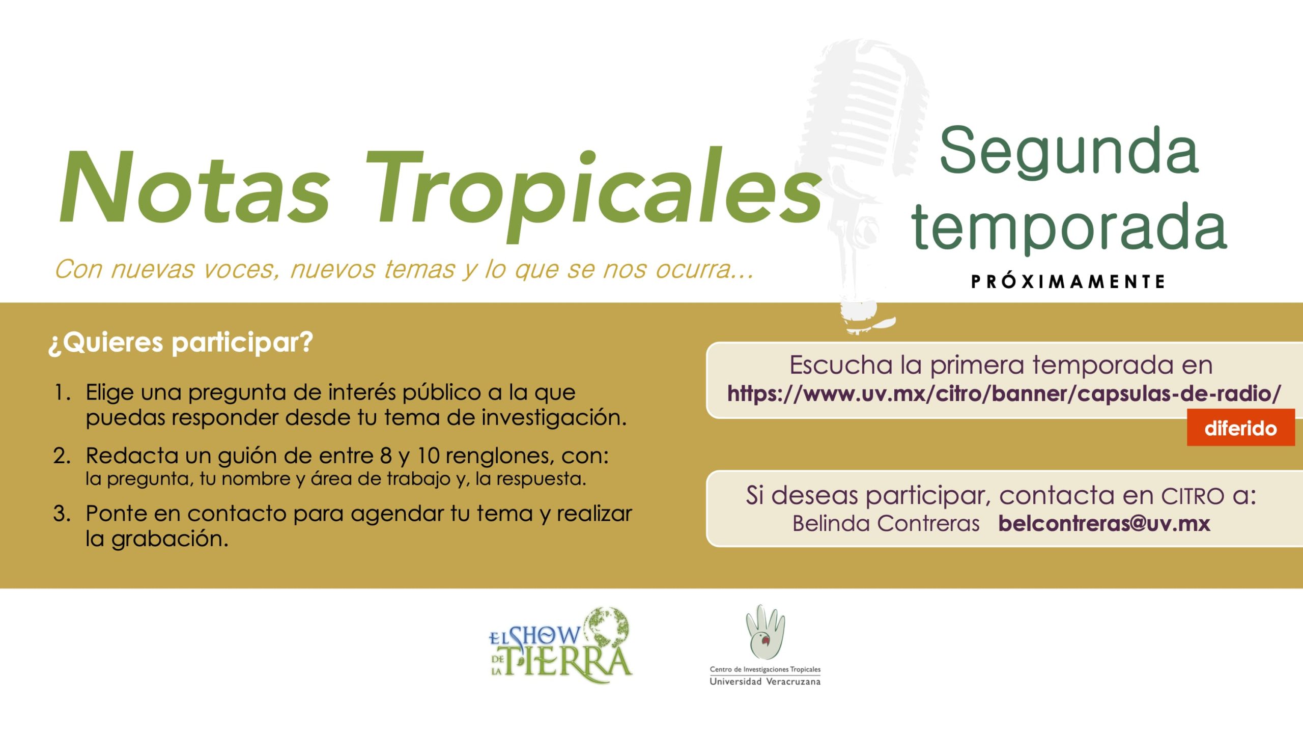 09/09/2024, Xalapa, Ver., Notas Tropicales, el espacio radiofónico creado para la comunidad CITRO, dentro del programa El Show de la Tierra, se acerca a su primer aniversario. Para celebrarlo, este espacio arranca con una segunda temporada, en la cual podamos seguir difundiendo nuestro quehacer desde nuestras voces, las de nuestr@s colaborador@s y más. Gracias a quienes ya han sido parte de esta experiencia. Si quieres volver a ser parte o aún no lo has hecho, ¡acércate y participa!