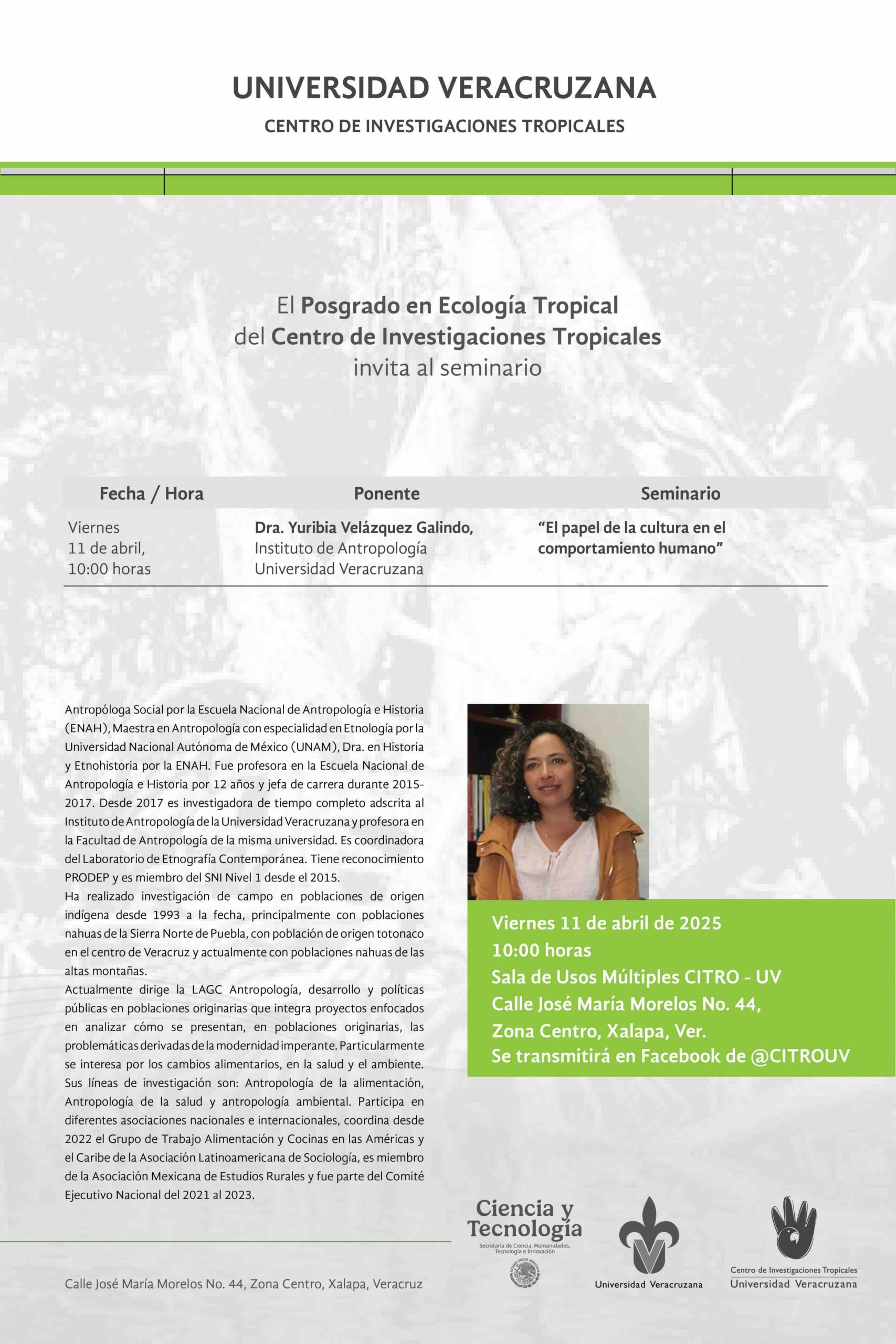 8/04/2025, Xalapa, Ver. El Posgrado en Ecología Tropical del Centro de Investigaciones Tropicales de la Universidad Veracruzana invita a la comunidad universitaria y público en general al Seminario ‘’El papel de la cultura en el comportamiento humano‘’ que impartirá la Dra. Yuribia Velázquez Galindo del Instituto de Antropología de la Universidad Veracruzana, el próximo viernes 11 de abril a las 10:00 horas, en la Sala de Usos Múltiples del Centro de Investigaciones Tropicales de la Universidad Veracruzana, ubicada en la Calles José María Morelos 44 de la Zona Centro de Xalapa, Ver.