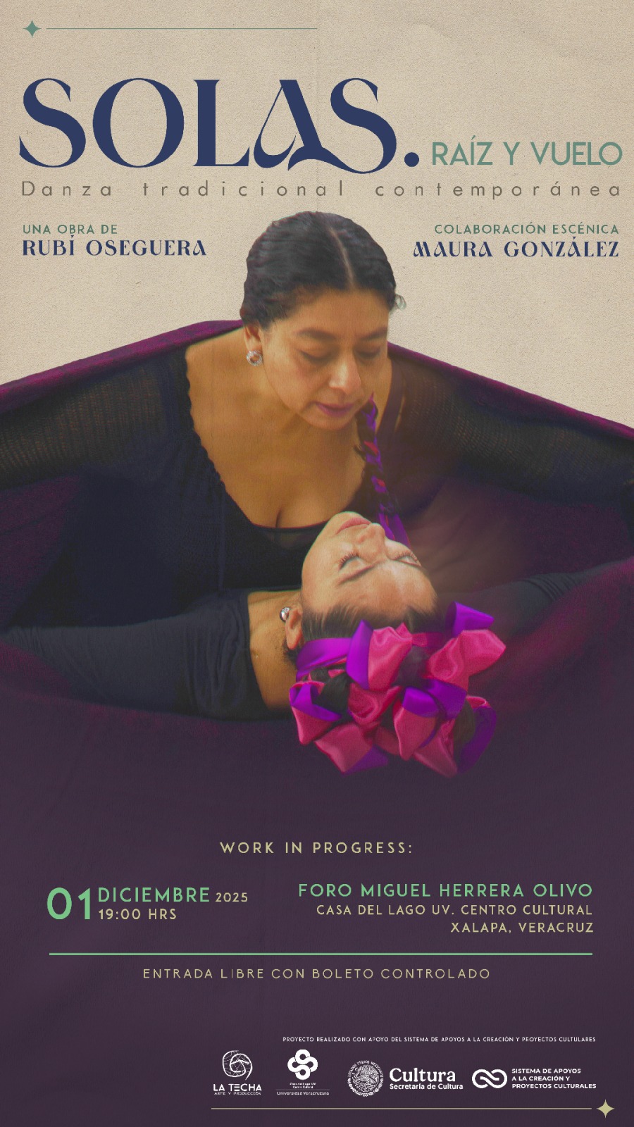 SOLAS. Raíz y vuelo es una obra de creada por Rubí Oseguera, reconocida bailadora, pionera y referente del zapateado y el baile jarocho. Esta producción contemporánea traza un retrato empoderador y creativo de dos mujeres, reflejando el viaje personal de cada una.