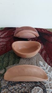 Tríptico «En víspera». Autor: Mtra. Rebeca Madrigal Barragán Técnica: Manual, Bruñidas. Marmoleados realizados con barro de El Chote Papantla y barro de Oaxaca. Realizadas con placas y cuerda bruñidas. Talleres Libres de Arte Poza Rica-Tuxpan