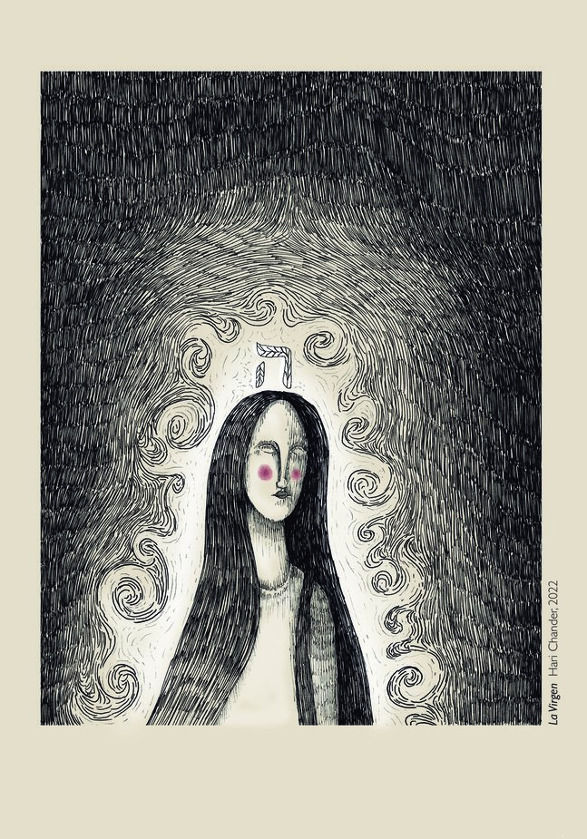 La Virgen Autor: Gamaliel Oliva (Hari Chander) Técnica: Tinta china/retoque digital Medidas: 43×30 cm aprox. Talleres Libres de Arte Naolinco