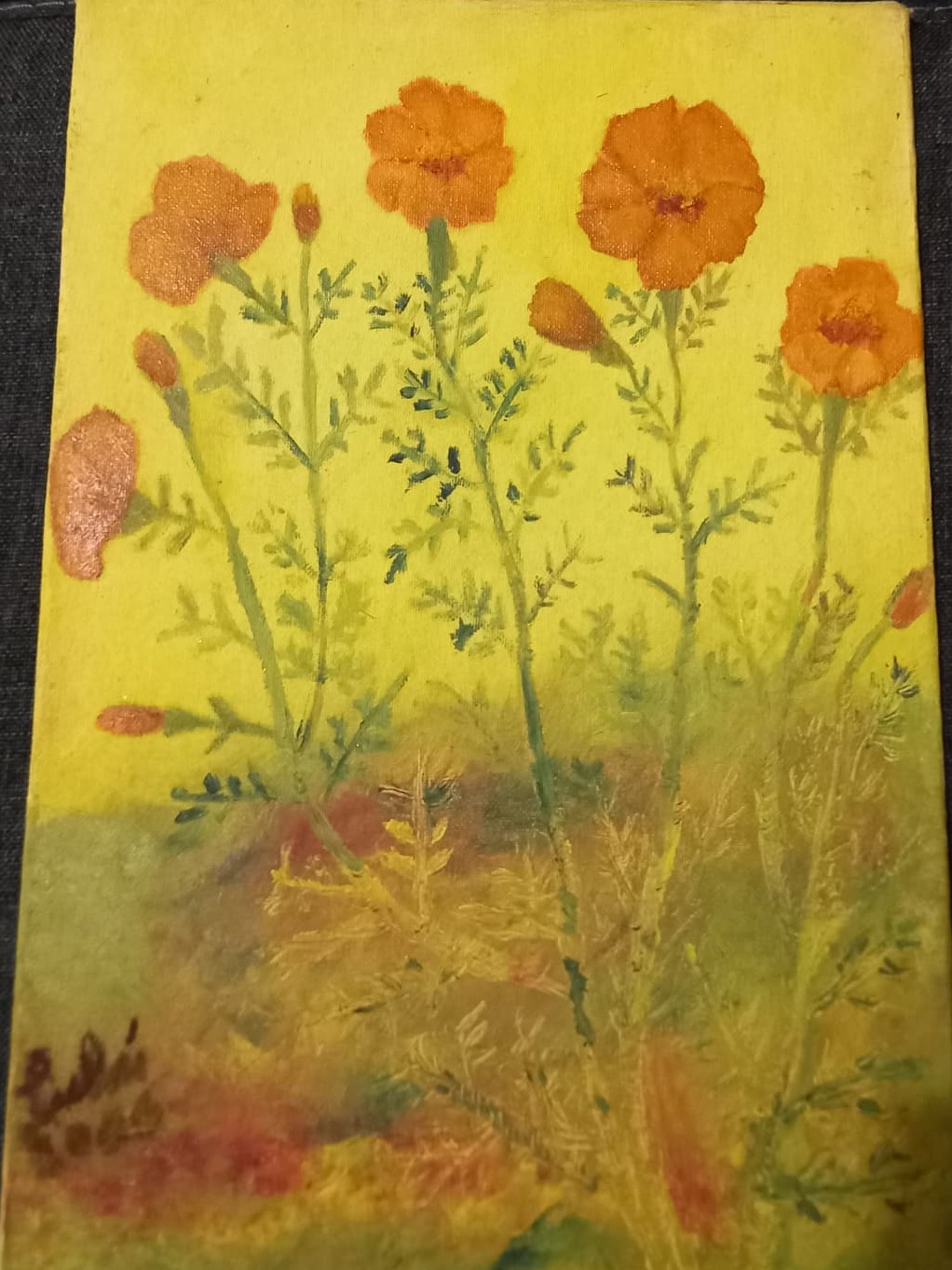 Cempasuchil Autor: Bernarda Lourdes Luna Rodríguez Técnica: Óleo sobre tela Medidas 30 x 20 cm