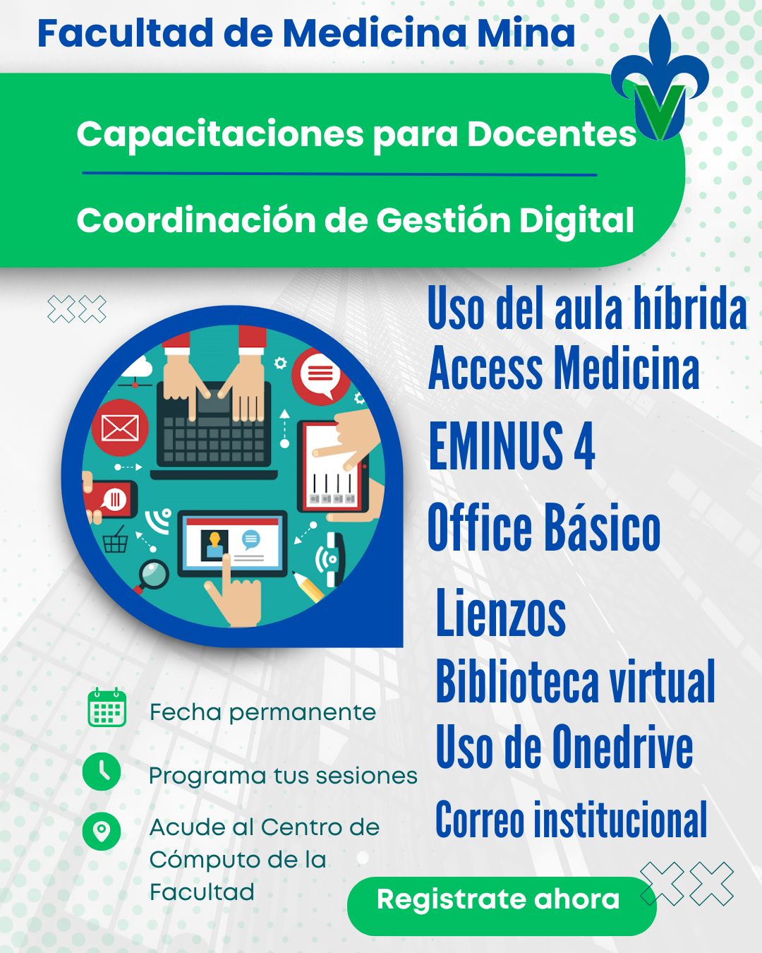 La Facultad de Medicina, comprometida con la mejora continua y la excelencia educativa, ha diseñado un programa de capacitaciones rápidas para los docentes. Este catálogo busca consolidar el dominio de herramientas tecnológicas y de comunicación multimodal, esenciales en un entorno educativo híbrido y multiplataforma.