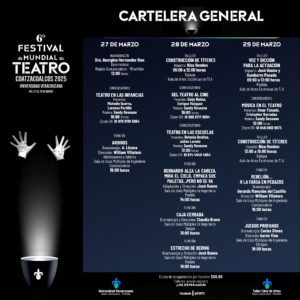 El 6° Festival Día Mundial del Teatro Coatzacoalcos 2025, contempló, eventos con artistas estatales y nacionales de la disciplina de teatro, realizado del 27 al 29 de marzo de 2025. En el que se presentaron puestas en escena y actividades complementarias: talleres y conversatorios. Con el fin de promover las manifestaciones artísticas y culturales de excelencia a través de nuestra universidad, al ofrecer a la población estudiantil y público en general, una programación de eventos que incluya artistas locales, estatales y nacionales, con la finalidad de fortalecer la creación de público a través de las artes, así como realizar actividades de promoción en el ámbito de las artes escénicas, con productos culturales de calidad.