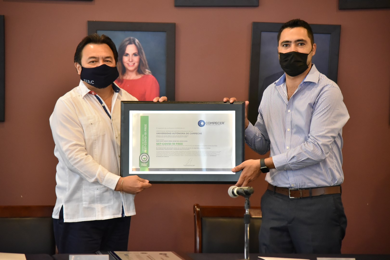 Como resultado del cumplimiento de todos los requisitos establecidos por las autoridades sanitarias y por la norma ISO 45001:2018 de Seguridad y Salud en el Trabajo, la casa certificadora COMPECER otorgó a la Universidad Autónoma de Campeche el distintivo SST-COVID-19 Free, siendo la primera institución de todo el sector educativo de México con este reconocimiento.