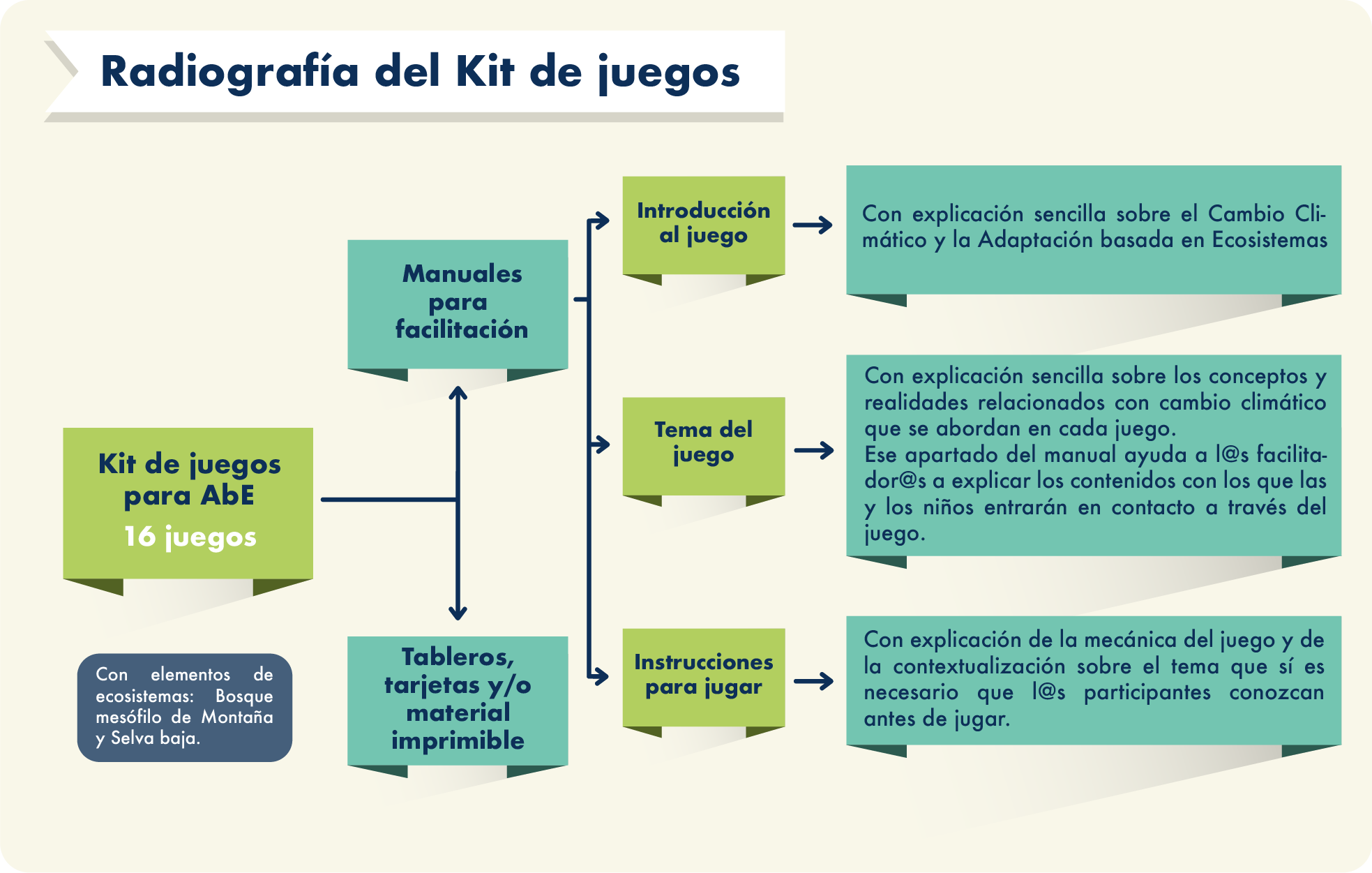 Como resultado del trabajo de investigación, diseño pedagógico y gráfico, se obtuvieron 16 juegos para acercar a la niñez a temas de cambio climático y adaptación basada en ecosistemas (AbE) mediante soluciones basadas en naturaleza (SbN). Cada juego se compone del material didáctico y de un manual para facilitadores para ampliar las conversaciones a través del apoyo conceptual, preguntas detonadoras y otras sugerencias para la construcción del conocimiento que se ofrecen en el manual.