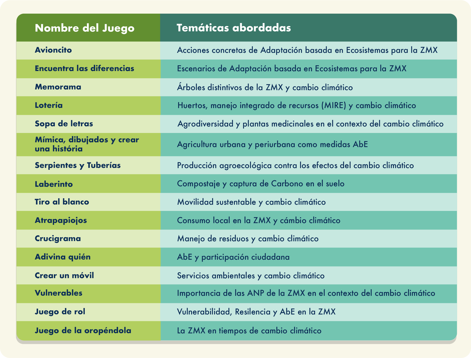 A partir de la propuesta del cómic Adaptápolis en Xalapa [B] y sus elementos gráficos y conceptuales, se realizó la elección de varios juegos populares para reinterpretarlos con temas pertinentes para AbE y se contextualizaron con elementos de los ecosistemas presentes en la zona; aunque cabe destacar que los juegos pueden ser replicables con cualquier parte del país al proponer temáticas como composta, consumo consciente, participación ciudadana, agrodiversidad, entre otros.