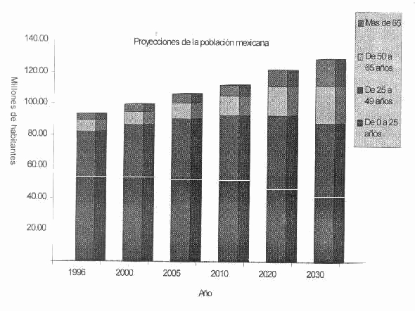 4. La pirámide poblacional está cambiando su estructura y en el mediano plazo los cambios serán más significativos. Según estima Conapo, de aquí al año 2005 el número de habitantes menores de 24 años descenderá de 53.1 a 52.7 millones de habitantes. Esto significa que la demanda potenhasta millones en el 2030 (véanse cuadro 3 y gráfica). Si oficialmente se informa que existe infraestructura suficiente para cubrir la demanda de la educación básica, especialmente de primaria y si se piensa tradicional del sistema educativo y en las políticas restrictivas vigentes desde hace más de una década, entonces el número de nuevos maestros tendería a reducirse y a casi constante, sólo con la renovación natural por decesos y jubilaciones.