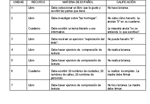Al indagar sobre las causas por las que el niño no realizó la tarea en casa, se encontró que la tarea implica, algunas veces, la ayuda de la madre y ella no puede sentarse con él a realizarla. Por ejemplo, cuando tiene que investigar sobre las hormigas no sabe cómo hacerlo y tampoco tiene los recursos de apoyo en casa, como puede ser una enciclopedia o libros de cultura complementarios. Cuando llega a realizar como tarea un texto libre, escribe con letra muy pequeñita y tenue mostrando inseguridad. No sabe cómo realizar los ejercicios de comprensión de lectura. El niño no tiene la disposición personal para hacer la tarea. Se rebela a escribir sesenta nombres propios y escribe sólo una parte de ellos.