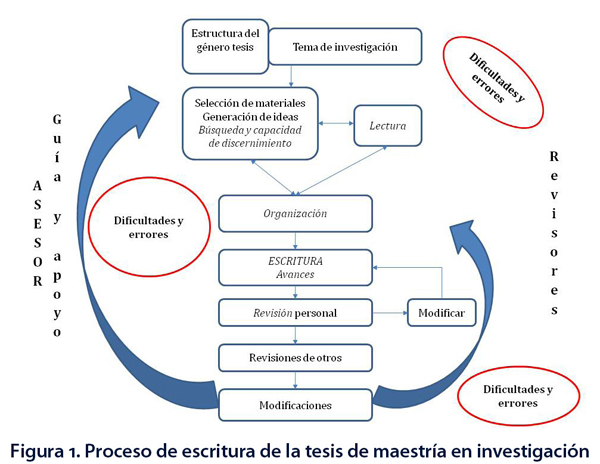 Estas dificultades fueron superadas a través de diferentes estrategias. Ambos utilizaron la revisión de materiales de redacción. De manera específica, Gabriela revisó tesis que le sirvieron de ejemplo para saber qué apartados incluía este tipo de textos y cómo se escribían. Además, los libros de redacción que le proporcionó su asesora fueron una ayuda para elegir un modelo de escritura. De igual manera, ambos se apoyaron de la revisión de sus asesores y de otras personas, quienes señalaban elementos que no eran claros, aspectos referentes al orden y pertinencia o no de la información, así como aspectos de ortografía. Otra estrategia fue apoyarse en el aprendizaje de las asignaturas de posgrado donde se trabajaron la revisión de la escritura, de la tesis y del estilo de la American Psychological Association (APA). En síntesis, para las categorías de análisis se identificaron semejanzas y diferencias en las experiencias vividas por los participantes. Su proceso de escritura científica se puede agrupar en seis etapas y acompañado de un comité revisor que, a través de sus observaciones, señala oportunidades de mejora para el escrito. Con relación a las dificultades identificadas, éstas se pueden presentar en diferentes momentos y se agruparon de la siguiente manera, referentes al género tesis, a las características de la escritura científica, a la estructura, al formato, a la lectura en inglés, al aspecto gramatical y a las peculiaridades de cada caso. Se puede identificar que las estrategias para superarlas estuvieron enmarcadas por el apoyo de asesores, revisores y docentes. Discusión y consideraciones finales Proceso de escritura Con base en los casos estudiados, la escritura de la tesis se ve como un proceso individual, guiado principalmente por el asesor, no exento de dificultades y errores. Asimismo, las actividades desarrolladas por los participantes permiten vislumbrar los elementos de los modelos cognitivos del proceso de escritura. Aunque ni el objetivo del estudio ni su metodología fueron enfocados a la identificación de los procesos cognitivos, la referencia a éstos brindará un panorama más amplio para comprender el objeto de estudio: la escritura de tesis de posgrado, sus participantes y sus dificultades. A continuación se comentan los resultados del proceso de escritura a la luz del modelo cognitivo de la composición escrita de Hayes (1996, en Cassany, 1999) y de las actividades propuestas por Carlino (2006) y Miras y Solé (2007) para la producción de textos científicos. Las actividades realizadas por los egresados para la escritura de su tesis, de manera general, son similares a las propuestas por Carlino (2006). En ambas se identifica un tema, el género discursivo y la estructura del trabajo; se leen materiales y se dialoga con otras personas; se escribe de acuerdo con las características del género discursivo, y se revisa lo que se ha elaborado. La diferencia encontrada fue la falta de identificación de la audiencia o público al que va dirigido el texto y la correspondiente escritura con base en este público por parte de los participantes de este estudio. En tal sentido, los asesores fueron quienes en algún momento señalaron la importancia de expresar las ideas con claridad para que los lectores comprendieran el texto. De las actividades de los participantes se puede inferir el proceso cognitivo de interpretación textual, señalado por Hayes (1996) como la comprensión que se logra para elaborar un texto a partir de las diferentes fuentes de información (lecturas, diálogo con otras personas, esquemas). La lectura es una actividad capital dentro de la interpretación textual y cumple varias funciones identificadas en el proceso de los participantes. Se puede hablar de una lectura exploratoria y selectiva durante la búsqueda de materiales y su selección; de una lectura de comprensión de los textos así como de una lectura de revisión de los avances escritos (Miras & Solé, 2007). La reflexión es otro proceso cognitivo propuesto por Hayes (1996) que se identifica a través de los productos o acciones que desarrolla el tesista. Por ejemplo, los esquemas de trabajo, las tablas de concentrado de información y los primeros avances son productos que el tesista genera a partir del análisis de su información (conocido como proceso de planeación en el modelo de Flower & Hayes, 1981). Lo que Hayes (1996) señala como un proceso de reflexión, de acuerdo con Miras y Solé (2007), implica diferentes formas de escritura que se identificaron en los participantes; por ejemplo, la exploratoria, que se refiere a los resúmenes o ideas generadas; la de elaboración, que incluye los esquemas y borradores o avances, y la comunicativa, la cual requiere del cumplimiento de todas las normas señaladas en el campo científico. De acuerdo con Carlino (2006), los dos primeros tipos se refieren a una escritura privada y el último es conocido como escritura pública. Asimismo, la selección de las estrategias para escribir y para enfrentar las dificultades de su escritura son formas de expresar el proceso de reflexión. El tercer proceso es la textualización (también señalado por Flower & Hayes, 1981) o la escritura de los planes e ideas que se han generado, es decir, la escritura o la elaboración de los signos convencionales que se realiza con lápiz y papel o a través de medios electrónicos. Cabe mencionar que la capacidad de discernimiento, proceso cognitivo no señalado en los modelos de escritura revisados para este estudio (Flower & Hayes, 1981; Hayes, 1996), se reconoce como parte del proceso que debe realizar el productor de una tesis. Los participantes en la escritura de la tesis De acuerdo con los procesos de cada participante, tanto el asesor como los revisores estuvieron presentes, en mayor o menor medida, durante la elaboración de toda la tesis a través de diversas actividades, principalmente en la revisión de los avanc