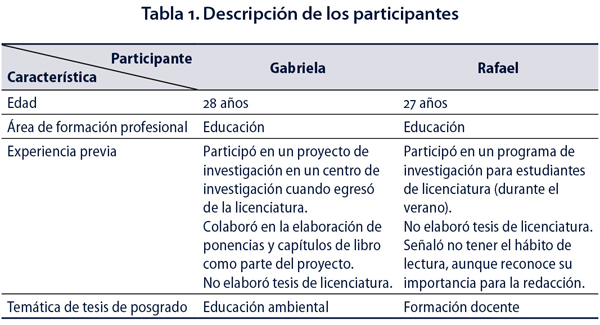Para lograr el objetivo de esta investigación se empleó un estudio de casos instrumental, que de acuerdo con Stake (2005) significa que a partir de uno o varios casos se conoce y comprende un fenómeno particular (la escritura de la tesis) sin que el interés sea el caso mismo. El estudio se realizó con egresados de la Maestría en Investigación Educativa en una universidad del sureste de México, donde se identificaron diversas situaciones problemáticas reportadas por los docentes con respecto a la escritura de los estudiantes. Los participantes fueron seleccionados con base en los siguientes criterios: 1) pertenecer a la generación que ingresó en 2007 a la Maestría; 2) haber presentado el examen de grado; 3) tener disposición y tiempo para colaborar en el estudio así como la facilidad de proporcionar sus avances de tesis. Estos criterios se establecieron porque al haber egresado y presentado su examen de grado, el participante podría brindar información de todo su proceso. Con base en lo anterior, en la investigación participaron cuatro egresados. Para este artículo se presentan dos casos, Gabriela y Rafael, cuyas características generales se muestran en la Tabla 1.