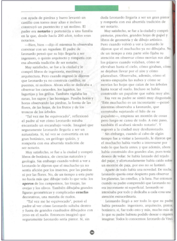 A la realización de las dos primeras secciones se sumó, inicialmente, la lectura del texto que fue de dos tipos, una en voz alta por turnos[6] y otra con apoyo del recurso de Enciclomedia.[7] Después de la última lectura del texto la profesora leyó y explicó las orientaciones del guión didáctico, pero con algunos ajustes. A continuación se describe en qué consistían las actividades que el guión proponía realizar para después explicar qué modificaciones hizo la profesora: a) Primera sección: “Intercambio de ideas” Este apartado inicia comentando que el texto leído (ver anexos 1 y 2) narra cómo pudo haber sido la niñez de Leonardo da Vinci, y les indica que éste fue un brillante sabio que vivió hace más de 500 años. Luego sugiere tres preguntas para que los estudiantes comentaran con sus compañeros: