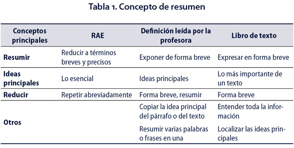 Aquí sólo se define en una frase: “expresar en forma breve lo más importante de un texto”, pero llama la atención la recomendación “es necesario entender toda la información y luego localizar las ideas principales”, debido a que implícitamente deja clara la condición de comprender el texto en su conjunto, localizar las ideas principales y luego expresarlas de forma breve. Estas acciones pueden considerarse tareas, al igual que en la anterior definición, que requieren jerarquizar o valorizar la información y clasificarla como “principal” o “secundaria”, para luego expresar sólo la primera en forma breve. Esta definición también indica de manera explícita qué orden se puede seguir para elaborar un resumen. Hasta al momento, tanto la definición leída por la profesora como la del libro de texto parecen coincidir, pero para comparar las tres definiciones las presentamos en la Tabla 1. La definición del libro de texto y la que leyó la profesora, por retomarlas de recursos didácticos, además de definir lo que es resumen le sugieren al alumno acciones sobre cómo elaborarlo. Tienen términos semejantes, lo que evidencia coherencia entre los recursos didácticos, y en sí las recomendaciones parecen complementarse.[4] Las tres definiciones plantean la necesidad de reducir el texto, lo que parece constituirse como característica principal del resumen, pero también la localización de las ideas principales o lo “esencial”, que no debe caracterizarse como una tarea estándar u homogénea, ya que cada lector, de acuerdo con sus experiencias, definirá qué es lo principal y qué lo secundario.