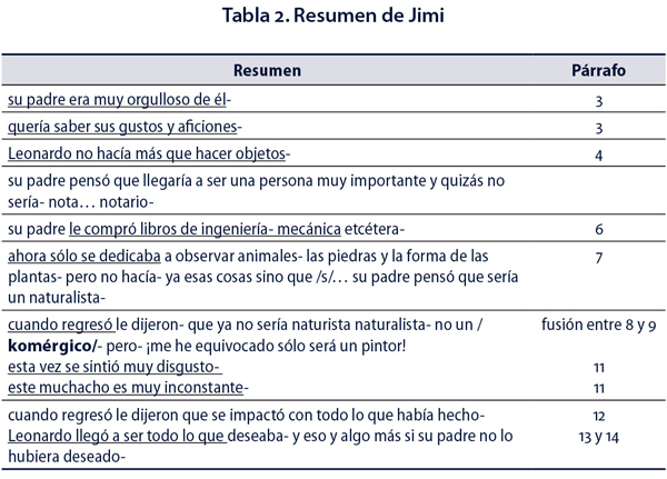 Es probable que si la profesora hubiera intentado realizar todas las actividades que el guión proponía, no le habría alcanzado el tiempo de la clase para que sus estudiantes las llevaran a cabo. Por otro lado, explorando el guión didáctico se advirtió que el didacta[10] tomó la decisión de focalizar la atención de los alumnos en las ideas principales del texto (vistas desde el punto de vista de él y no del alumno), pues decidió qué era lo más importante del texto al pedirles a los estudiantes qué subrayar. Aunque en términos operativos esta decisión le brindó apoyo a la maestra para orientar la redacción de los resúmenes, en la revisión de los mismos ella no enfatizó o hizo algún señalamiento sobre esas ideas principales. En un primer momento los estudiantes y la maestra ya habían comentado (en la sección del intercambio de ideas) de qué trataba el texto y cuáles eran algunas ideas principales, pero para la elaboración del resumen no deciden cuáles son esas ideas sino que lo hace el guión al indicarles subrayar únicamente “Las aficiones de Leonardo” y “Lo que el padre de Leonardo pensaba, creía o se imaginaba al darse cuenta de los gustos de su hijo”. En términos generales, aunque posiblemente en otra clase y con otra lección, el propósito del guión didáctico sea que los estudiantes seleccionen esas “ideas principales”, en este caso, el guión ahorró ese paso: discriminar qué es lo más importante. Producción escrita en el aula: los resúmenes de los estudiantes En los anexos 1 y 2 se muestra el texto que leyeron y se puede apreciar que era relativamente amplio. Está compuesto por un título, 14 párrafos con 776 palabras. En siete ocasiones hace mención que para el papá de Leonardo, uno de los personajes de la historia, la tradición familiar de ser notario era aburrida. Hasta al final comenta que el personaje principal es Leonardo da Vinci. Como se indicó, la recomendación del libro para elaborar el resumen consistía en retomar frases para enlazar las ideas y sólo resumir “Las aficiones de Leonardo” y “Lo que el padre de Leonardo creía o se imaginaba al darse cuenta de los gustos de su hijo”. A continuación se presentan las transcripciones de los resúmenes de cada niño y se muestra de qué párrafo fue extraída la idea. Además se indican con subrayado aquéllas ideas que son textuales o literales, es decir, que están de esa misma manera en el texto original. En los casos que no fue así, se indican con paréntesis aquéllas palabras que omitieron los estudiantes, lo cual no sabemos si fue de forma deliberada, aunque en algunos casos identificamos que la acción de omitir fue sistemática. El primer resumen que se leyó fue el de Jimi (Tabla 2).