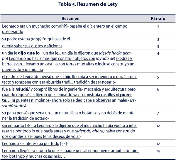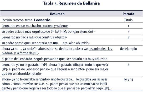 En el resumen de Jimi hay muchos fragmentos que no son literales, incluso uno de ellos es la fusión entre las ideas de dos párrafos. El estudiante sustituye unas palabras por otras y sólo menciona en una ocasión que el padre de Leonardo no quería que éste fuera notario, a pesar de que el texto original lo señala siete veces, lo que pone de manifiesto la intención de resumir. Una característica más de este resumen es el uso de la palabra “etcétera”, que también implica la acción de resumir. En cuanto a la significación que construye Jimi, es interesante la frase “¡me he equivocado-sólo será un pintor!”, porque muestra una apreciación cultural sobre el oficio de pintor y una idea divergente al texto (en este se habla de un “gran pintor”). Tal vez Jimi interpretó pintor de casas y no pintor de cuadros y con base en su apreciación, al utilizar la palabra sólo, se puede interpretar que para Jimi, la profesión de “pintor” (como él la entendió) no tiene el mismo prestigio que la profesión de ingeniero o naturalista. Otras interpretaciones, pero que sí son convergentes al texto, son: que Leonardo era motivo de orgullo para su papá, que el papá quería saber los gustos y aficiones de su hijo Leonardo, que se impactó al ver todo lo que hacía Leonardo y que Leonardo llegó a ser todo lo que él mismo había deseado. En la Tabla 3 se muestra el análisis del resumen de Bellanira, quien repite en más de dos ocasiones las palabras pensó, Leonardo y ahora. Sin embargo, con esta última palabra se muestra un esfuerzo por conectar las frases y darle coherencia al resumen. Hay pocas ideas textuales, pero una de ellas llama la atención por ser una interpretación divergente al texto. Bellanira menciona en tres ocasiones “que el papá pensaba que ser notario era aburrido”, lo cual no es exactamente así, ya que la expresión original es “… la aburrida tradición de ser notario”. Es decir, Bellanira interpretó que ser notario es aburrido en vez de que aburrida era la tradición de ser notario. Otras interpretaciones que sí son convergentes al texto fueron “que su papá pensó que Leonardo era inteligente” y que “llegaría a ser todo lo que él pensaba”. Estas frases no son textuales, pues son inferencias que surgen a partir de otras expresiones que aparecen en el texto.