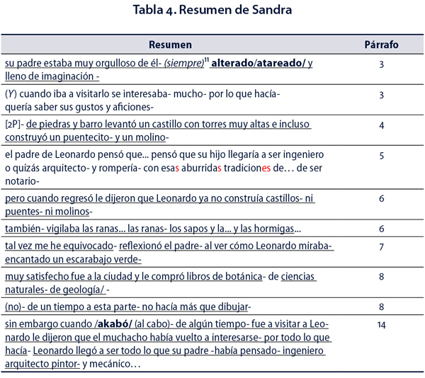 Bellanira resume bien la cuestión de señalar que Leonardo será pintor, pero se centra en esta profesión y no retoma las demás profesiones que el papá pensaba que Leonardo sería y que se concentraban en los párrafos once, doce y trece. Como se puede apreciar, es un resumen con una mezcla, en menor medida, de copia, y en su mayoría, de síntesis; por ello es posible que en cierta medida esté desarticulado. En la Tabla 4 se muestra el resumen de Sandra. Al parecer, en este texto todas las ideas son textuales. No buscó sinónimos ni sustituyó ideas secundarias; por ejemplo, no resumió en una sola frase (como lo pedía y mostró el ejemplo del libro) la mención de los animales. Del párrafo ocho se saltó al catorce (al igual que Bellanira), probablemente porque se le acabó el tiempo. Esos párrafos explicaban que el papá, entre otras situaciones, creía que Leonardo sería pintor.