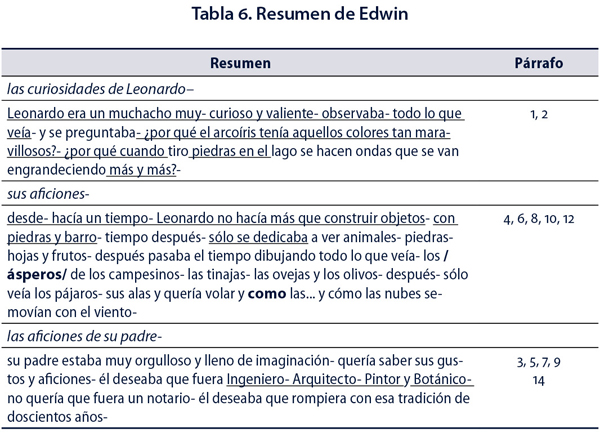 En términos de comprensión lectora en el resumen se observa que Sandra pluralizó la tradición de ser notario, lo que podría ser una interpretación divergente al texto porque sólo se mencionó una tradición, no varias. En este sentido, no podemos afirmar que los estudiantes, y en especial Sandra, hayan sabido con claridad qué es un notario, pues al inicio de la clase se leyó una definición de notario que incluía el glosario del libro de texto, pero esto no garantiza que los estudiantes la hayan comprendido. En este resumen, también se incluye la profesión de “mecánico” que probablemente infirió a partir de que el texto menciona que el papá de Leonardo le compra varios libros, entre ellos uno de mecánica. Este último dato es una inferencia que no podríamos caracterizar de divergente puesto que el texto expone los deseos de un padre por querer que su hijo tenga una profesión distinta a la que tradicionalmente se han dedicado los miembros de su familia. El texto no plantea la distinción entre oficios y profesiones (contenido que se revisaba en primer grado de primaria en el mismo plan de estudios de esta lección). No obstante, es posible que Sandra infiera mecánico por lo del libro de mecánica y porque lo considera un trabajo equivalente al de ingeniero, botánico, o arquitecto, mientras que para Jimi estas profesiones no son equivalentes a ser sólo pintor (de casas). En la Tabla 5 se observa el resumen de Lety. Ella repite en varias ocasiones la palabra Leonardo porque, al igual que Sandra, retomó varias ideas en forma textual. Sin embargo, una variante es que Lety eliminó palabras o pequeñas frases que pudieran reflejar ese intento (de resumir) por eliminar o sustituir frases secundarias que no tienen tanta importancia. La mayoría de las oraciones son convergentes al texto, quizá porque son copias más o menos fieles de éste, y por lo mismo, el resumen muestra coherencia, pues desarrolla el tema sin contradicciones; de esta forma enlaza cada una de las ideas o argumentos presentados en el texto, sin contradicciones (Munguía, 2005, p. 84). Al igual que Sandra y Bellanira, Lety no consideró nada de los párrafos ocho al trece. Dos veces señala que el papá quería romper con la aburrida tradición de ser notario. El resumen de Edwin fue diferente a los anteriores (Tabla 6). Como se observa, se divide en tres apartados y a cada uno Edwin le dio un título. Aunque se retomaron ideas textuales, fueron mínimas porque, incluso, en el último párrafo, donde se resumen las profesiones en que había pensado el papá de Leonardo, se retoma una idea del párrafo catorce, que las resume muy bien. Se aprecia coherencia entre títulos y contenido del texto, salvo la última parte. Interpreta que el papá está lleno de imaginación, cuando el texto dice que era Leonardo. Es posible que esta idea la haya asociado a la instrucción del guión didáctico que pedía subrayar lo que el papá “pensaba, creía, o se imaginaba”. Es el único estudiante que retoma algunas preguntas iniciales del párrafo 2 del texto original; además, en una de ellas sustituyó palabras por su sinónimo. Por ejemplo: