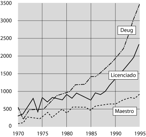 Hacia 1975, se expedían anualmente cerca de 500 diplomas de primer ciclo de sociología; en 1995, 3,500 (gráfica 2). El DEUG de sociología experimenta así, de manera amplificada, la evolución general del número de universitarios: la cifra total de estudiantes en las universidades (fuera del IUT16 y formaciones de ingenieros) había aumentado por año 2.2% de 1970 a 1980, y 3.2% de 1980 a 1990; el ritmo asciende a 4.3% por año de 1990 a 1995.