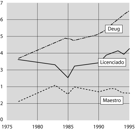 El aumento es menos rápido para las licenciaturas y sobre todo para las maestrías en sociología (de 300 en 1975 a 800 en 1995 [gráficas 2 y 3]). A mediados de los 70, a cada tres DEUG expedidos correspondían, dos años más tarde, dos maestrías aproximadamente. Veinte años más tarde, ya no se cuenta más que con una maestría por tres DEUG.17 Trabajar mientras se estudia es frecuente.18 Si los estudiantes de licenciatura y de maestría son en su mayoría egresados de un DEUG de sociología, la idea común según la cual los diferentes ciclos de sociología constituyen una “carrera” es algo ilusorio debido a las constantes deserciones, reorientaciones, conversiones tardías a la sociología.19