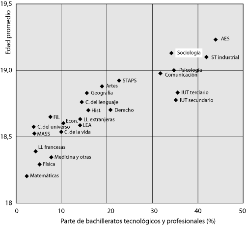 La diferencia entre las formaciones que realizan una selección de ingreso y las que son francamente accesibles a los bachilleres aumenta. En 15 años, la parte de los titulares de un baccalauréat tecnológico o profesional se incrementó sensiblemente en sociología, pasando del 25% al 33% de los bachilleres recién inscritos en el primer ciclo.25 Los DEUG de administración económica y social, de psicología, de historia, de lenguas extranjeras aplicadas, tuvieron evoluciones similares. En los IUT, en cambio, la parte de los bacs tecnológicos y profesionales disminuía. En el otoño de 1997, el Ministerio de Educación Nacional tenía la intención de penalizar a los IUT que admitían un porcentaje de bachilleres tecnológicos y profesionales inferior a la media (y favorecer a los que admitían una porcentaje superior) modulando su financiamiento, anteriormente proporcional al número de estudiantes; la contribución habría sido menor o mayor del 20% más allá de una cierta distancia de la media. Un movimiento de huelga mantenido por las direcciones se extendió a los IUT y el proyecto fue retirado. En seguida, el índice de acceso directo a los IUT de los bachilleres generalistas continuó aumentando, el de los titulares de un baccalauréat tecnológico, disminuyendo; la probabilidad de ir a un IUT era claramente mayor luego de la obtención de un bac general que después de un bac tecnológico.26