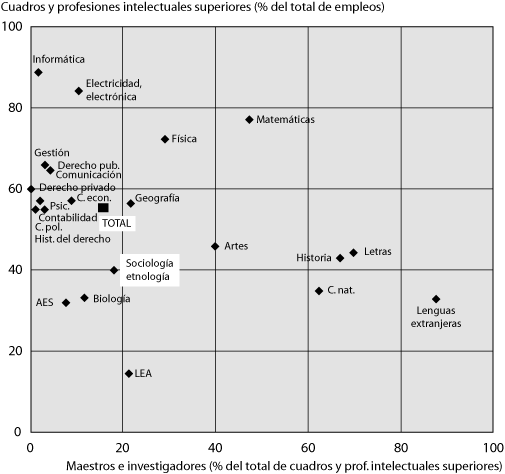 31. El porcentaje (estadísticamente no significativo) de los diplomados de sociología que han obtenido un CAPES, un CAPET o una agrégation es del 1%. Cerca del 3% de los diplomados de ciencias económicas en los niveles bac + 4 y bac + 5 son agrégés o certificados, el 9% de los geógrafos, el 19% de los físicos y naturalistas; entre los literatos y lingüistas, los historiadores y los matemáticos, las proporciones de certificados y agrégés van de 25 a 28%.