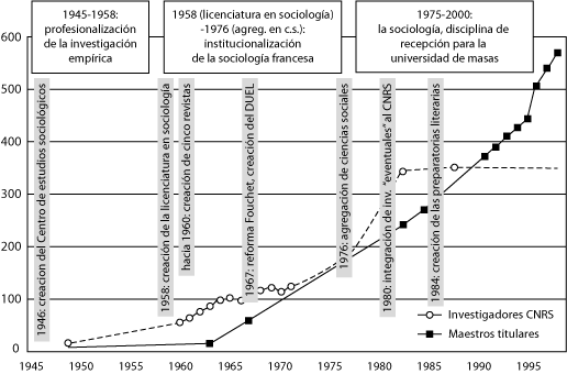 Gráfica 1. Las tres fases del desarrollo de la sociología en la universidad y en el CNRS después de 1945.