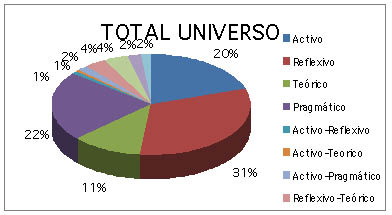 Fuente: Elaboración propia con base en los resultados de la encuesta. En segundo lugar, se encontró que 57 alumnos presentan un perfil que corresponde con un estilo de aprendizaje pragmático; este tipo de estudiantes buscan la aplicación práctica del conocimiento, por lo que se debe aprovechar cualquier oportunidad para que ellos experimenten, pues les gusta desarrollar proyectos prácticos. Así mismo, se impacientan con clases muy teóricas y muestran poco interés por los conocimientos que no les ayudan en sus necesidades inmediatas. Para estos alumnos, los docentes debemos detonar el aprendizaje con la pregunta ¿qué pasaría si? Las actividades de enseñanza que se sugieren para este tipo de alumnos son: enseñar técnicas para hacer las cosas con ventajas prácticas que permitan la comprobación inmediata del aprendizaje; exponer a los alumnos a modelos y enseñar por proyectos o experimentos; dar indicaciones y sugerir atajos; y, establecer gran cantidad de ejemplos y anécdotas. En tercer lugar, se encontró que 51 alumnos, casi el mismo número de alumnos pragmáticos, prefieren dialogar a escuchar por largo rato, les gusta dirigir debates, o realizar presentaciones. Son de mente abierta y se entusiasman con tareas novedosas, generalmente se les dificulta analizar e interpretar datos ya que presentan un estilo de aprendizaje activo. Los docentes debemos detonar el aprendizaje, para estos alumnos con la pregunta ¿cómo? Las actividades de enseñanza que se sugieren para este tipo de alumnos son: variar las estrategias de enseñanza y abordar multitareas.; la representar de roles o dramatizaciones; dirigir debates, o reuniones; pedir a los alumnos que hagan presentaciones; y, plantear problemas o dificultades exigentes y establecer mucho diálogo en el salón de clases y fuera de él. De particular interés, resultó el hecho de que sólo el 11% de los alumnos de los alumnos encuestados son alumnos que presentan un estilo de aprendizaje teórico, lo que podría explicar el alto índice de reprobación de las asignaturas teóricas. Para que se facilite la lectura de los resultados globales de la encuesta se presenta la siguiente gráfica. Gráfica 1. Resultados globales de cuestionarios de estilos de aprendizaje aplicados