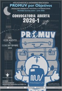 La Universidad Veracruzana, a través de la Dirección General de Relaciones Internacionales (DGRI), su Coordinación de Movilidad Estudiantil y Académica (CMOV) y la Unidad de Estudios de Posgrado (UEP) C O N V O C A N a estudiantes de licenciatura, técnico superior universitario y posgrado, dentro del sistema escolarizado, semi-escolarizado, abierto, mixto, virtual y a distancia de todas las áreas acádemicas, para participar en el Programa de Movilidad (PROMUV) por Objetivos de la Universidad Veracruzana para realizar intercambios académicos presenciales en organismos e instituciones nacionales e internacionales para el periodo enero – junio 2026. Este programa de la Universidad Veracruzana tiene la finalidad de atender las necesidades de formación, cooperación e innovación de la comunidad estudiantil mediante intercambios presenciales en espacios educativos diversos dentro y fuera de México, toda vez que resulta necesario expandir el horizonte y el campo de acción de los estudiantes para permitirles crear, innovar y participar activamente en escenarios académicos, productivos y sociales en todo el mundo.