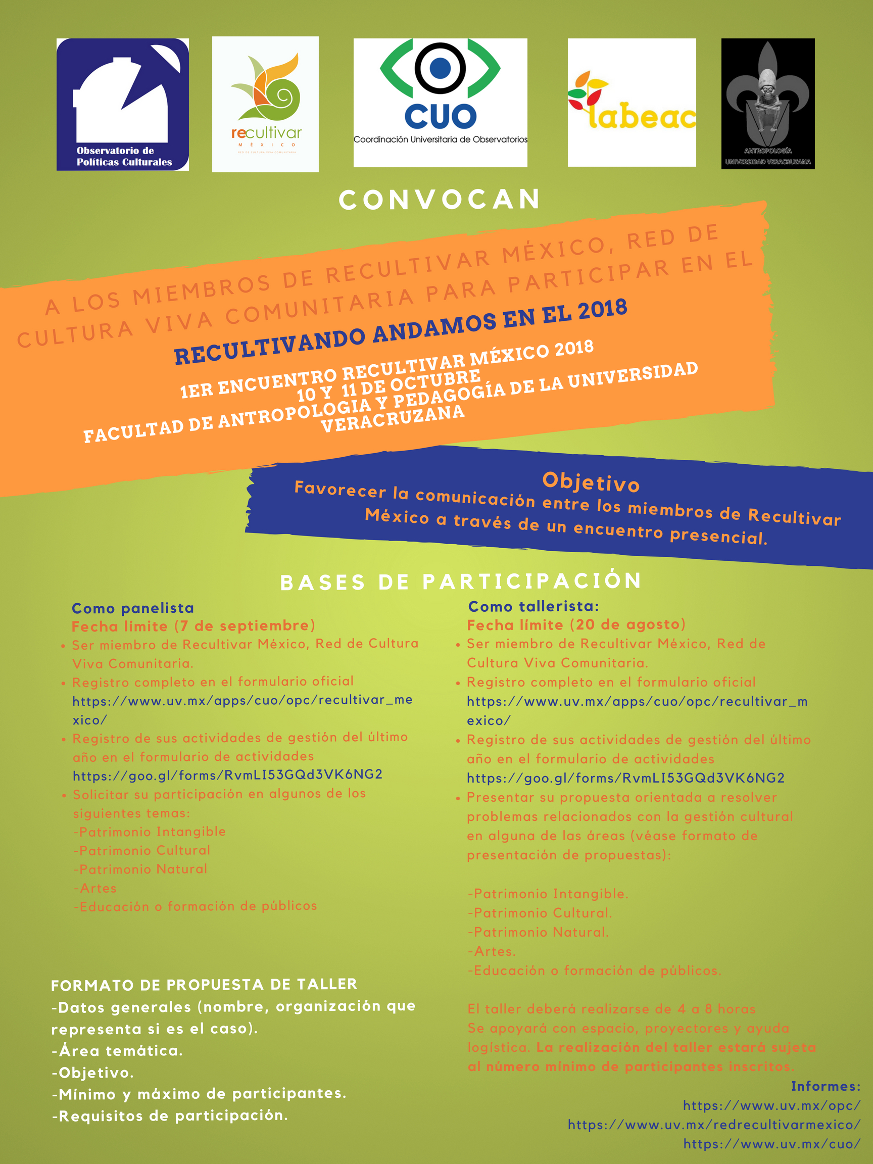 Mayor información consultar https://www.uv.mx/opc/noticias-y-convocatorias/1er-encuentro-recultivar-mexico-2018/