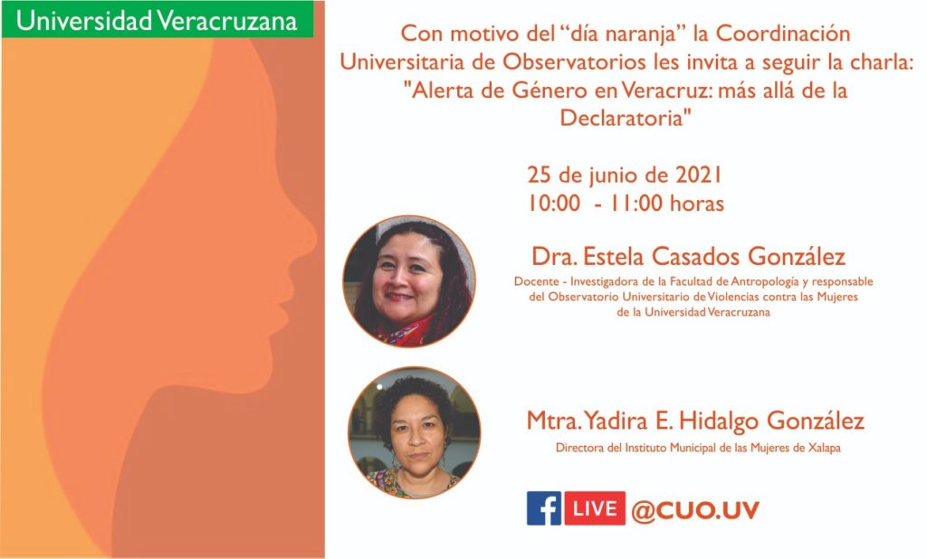 25 de mayo de 2021 «Día Naranja» – Charla «Alerta de Género: más allá de la Declaratoria» Unirse a la charla Facebook Live: https://www.facebook.com/CUO.UV/