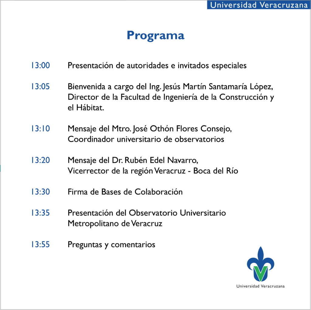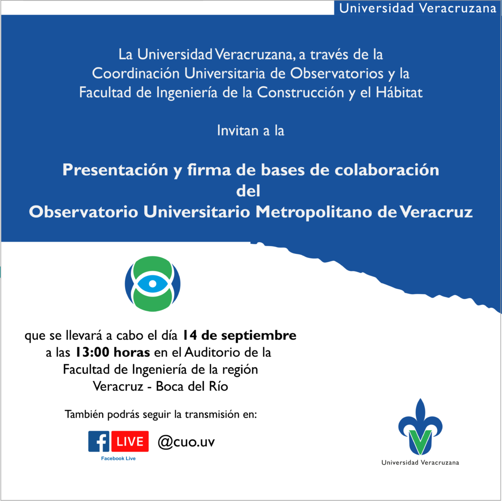 El 14 de septiembre de 2022 a las 13:00 horas se llevará a cabo la presentación y firma de bases de colaboración del Observatorio Universitario Metropolitano de Veracruz (OMV), cordialmente invitados.