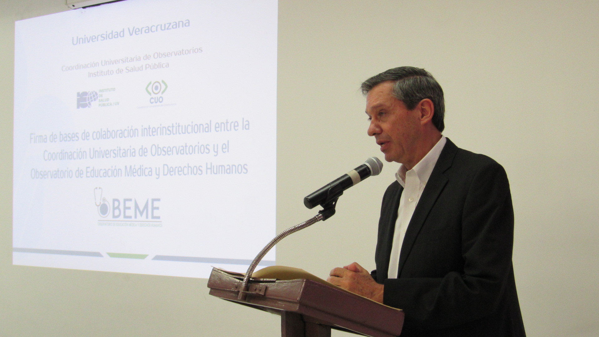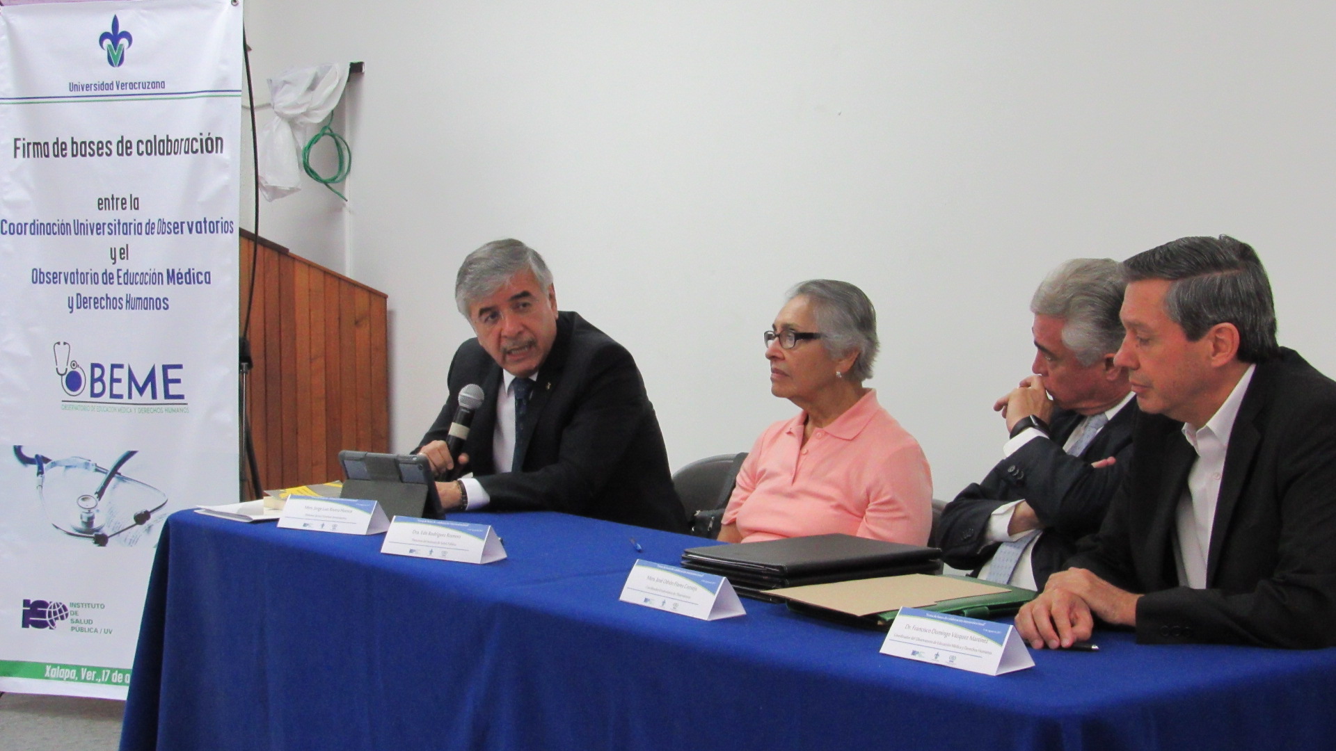 Esta mañana, en el Aula magna de la Unidad de Ciencias de la Salud, la Coordinación Universitaria de Observatorios firmó las bases de colaboración interinstitucional con el nuevo Observatorio de Educación Médica y Derechos Humanos, que llevará por siglas OBEME y el cual pertenecerá al Instituto de Salud Pública de la Universidad Veracruzana.