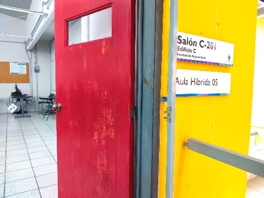 Se dispone en la Facultad de Arquitectura con 4 aulas para trabajo teórico con capacidad para 40 estudiantes en promedio cada una. Adicionalmente, existen 17 espacios para trabajo en modalidad de taller y cuya capacidad es de 50 estudiantes en promedio cada una. Todas las aulas, tanto teóricas como de talleres, están organizadas en tres niveles en torno a un patio central cubierto que a su vez es apto para la exposición de trabajos y, además, están equipadas con mesas de trabajo, sillas para el trabajo dinámico, pizarrón blanco, acceso inalámbrico a internet, y persianas para el control de luz. Así también, se tiene habilitado un espacio para actividades colaborativas de las y los estudiantes a través del aula de investigaciones, o bien, de trabajo cartográfico en el Observatorio Urbano Universitario. Figura 7, 8, 9 y 10.