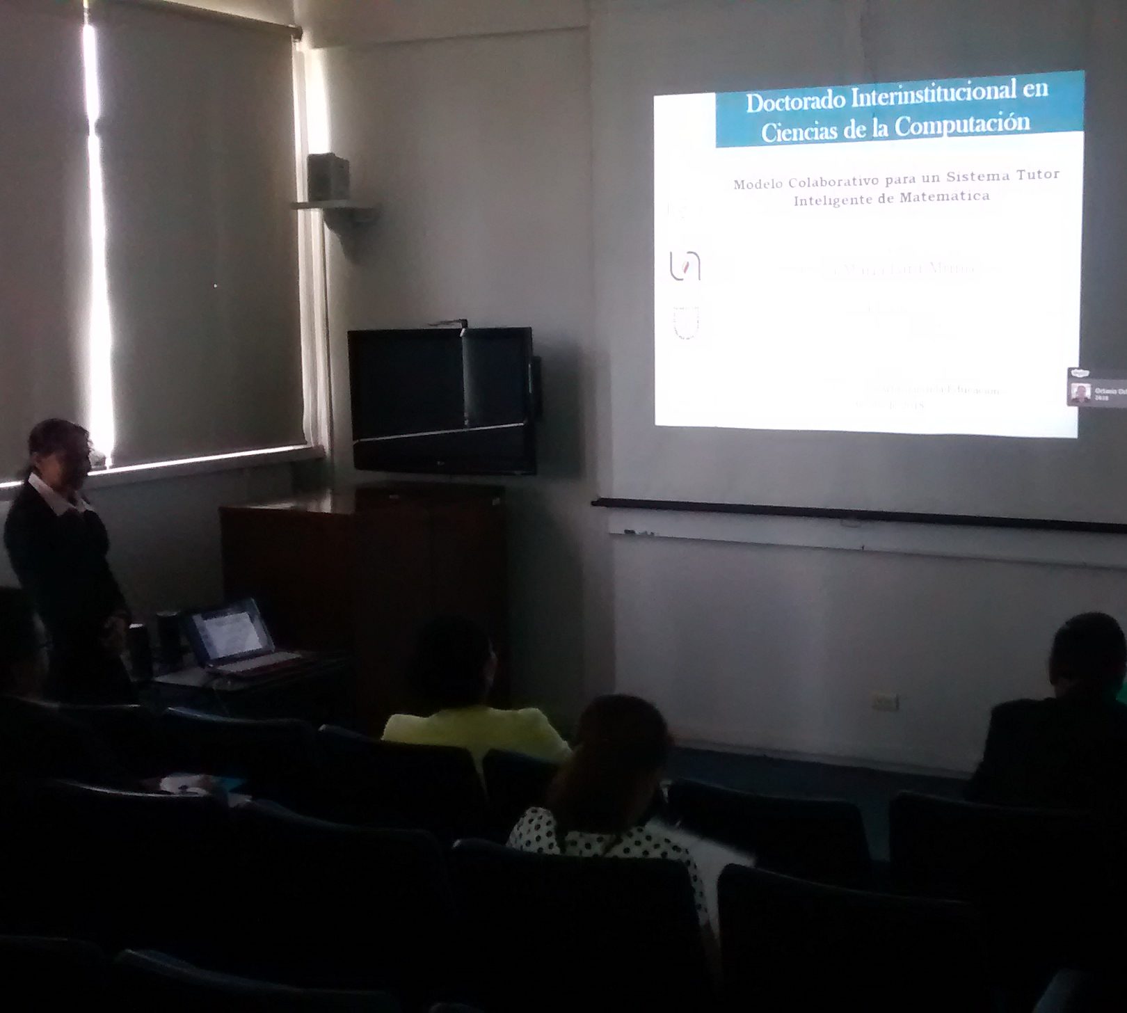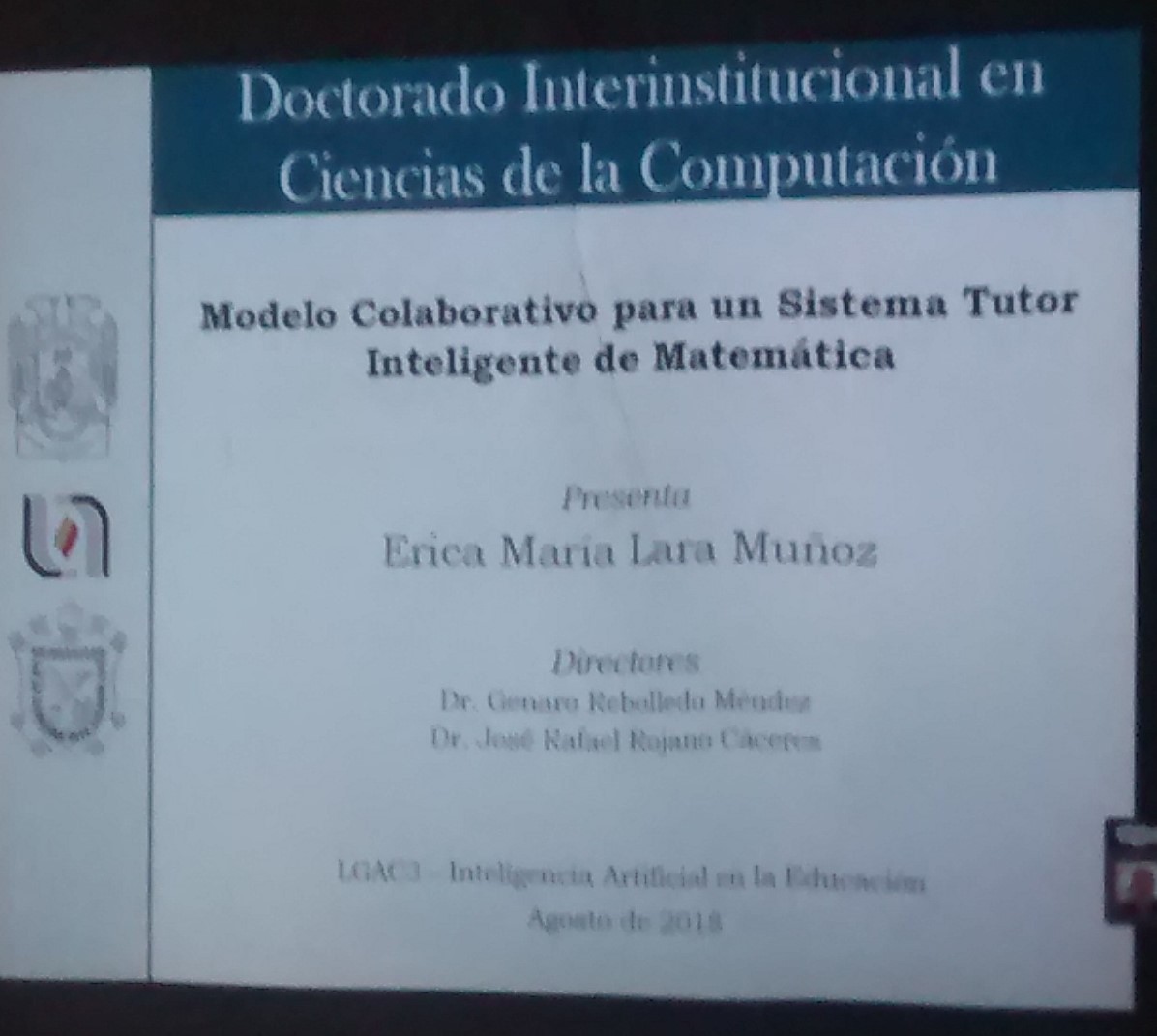 El pasado 09 de Agosto del 2018 a las 10:00 en la sala audiovisual de la FEI. se llevo a cabo la presentación del examen profesional de Erica María Lara Muñoz estudiante del Doctorado en Ciencias de la Computación intitulado «Modelo Colaborativo para un Sistema Tutor Inteligente de Matemática» y con ello obtener el grado de Doctora en Ciencias de la Computación.