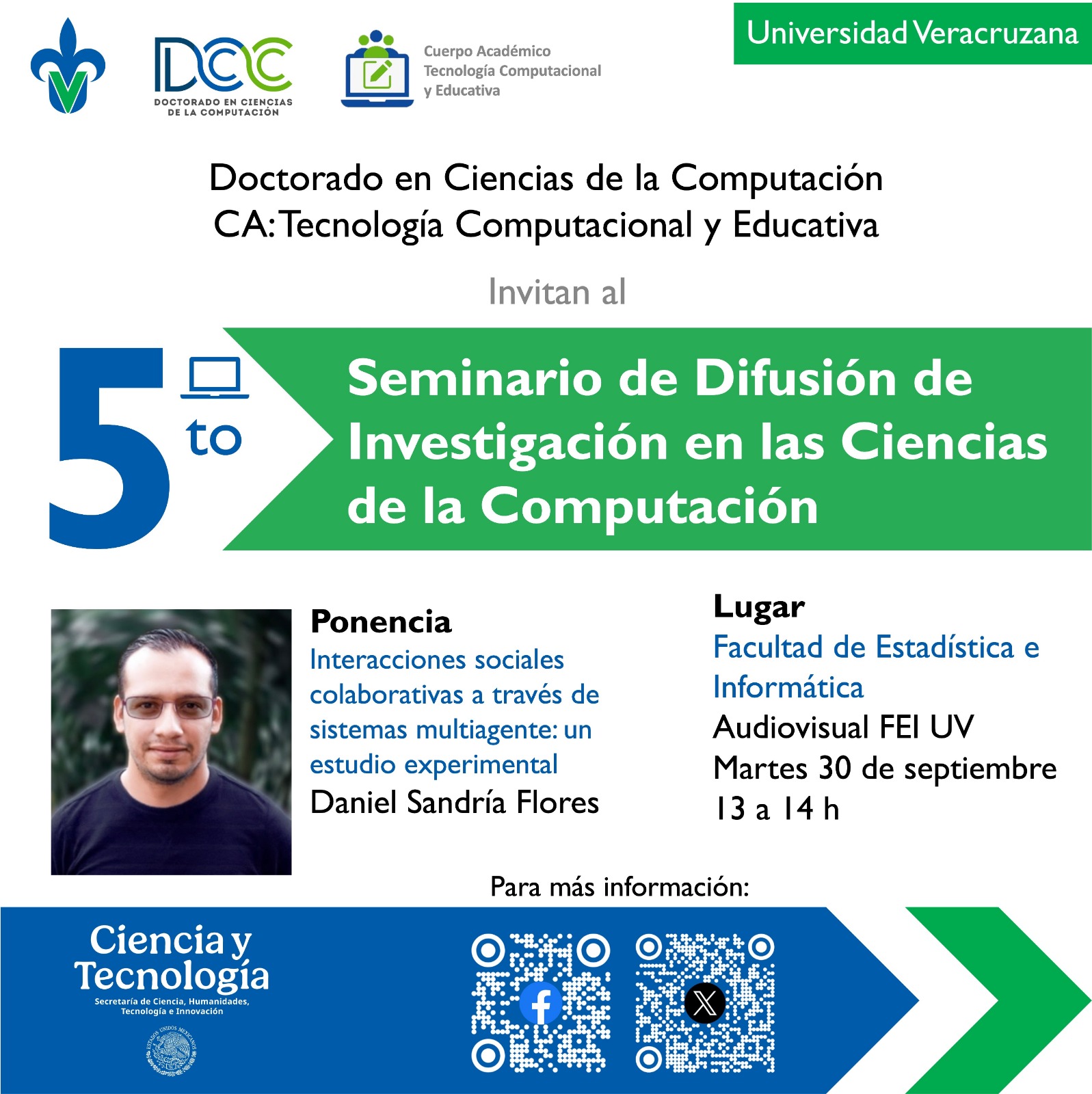 Ponencia a cargo de Daniel Sandría Flores, titulada «Interacciones Sociales Colaborativas a través de Sistemas Multiagente: un estudio Experimental», martes 30 de septiembre, Audiovisual de la FEI-UV, 13:00 hrs.