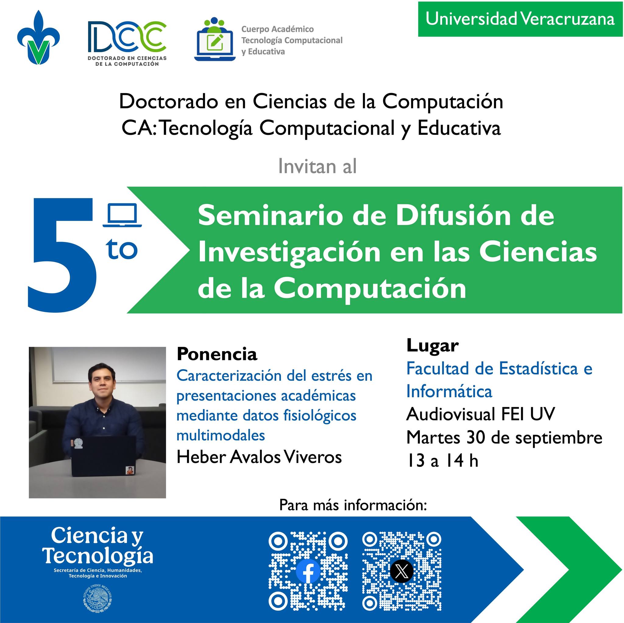 Ponencia a cargo del Mtro. Heber Avalos Viveros, titulada «Caracterización del estrés en presentaciones académicas mediante datos fisiológicos multimodales», martes 30 de septiembre, Audiovisual de la FEI-UV, 13:00 hrs.
