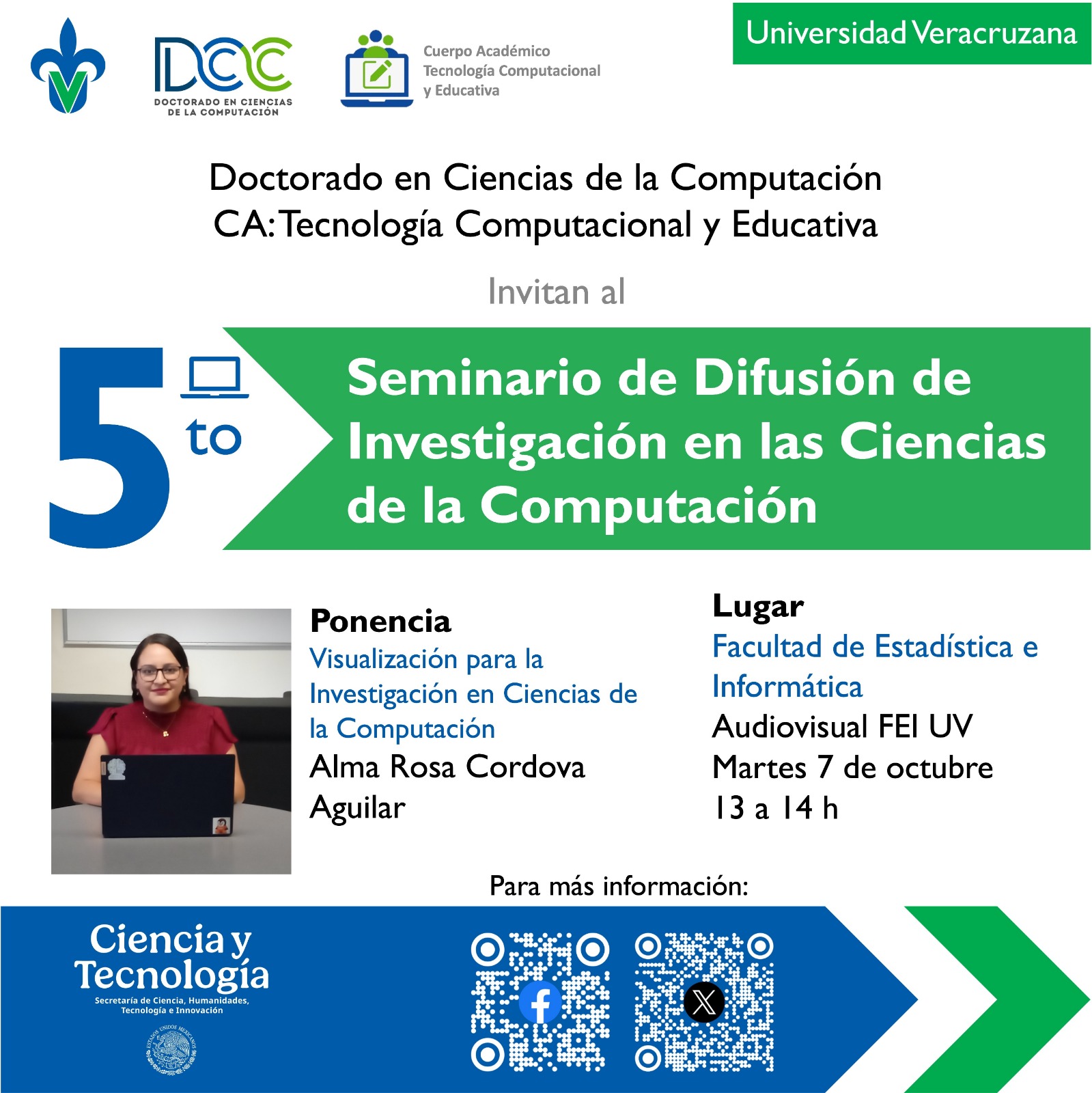 Ponencia a cargo de la 𝐌𝐭𝐫𝐚. 𝐀𝐥𝐦𝐚 𝐑𝐨𝐬𝐚 𝐂𝐨́𝐫𝐝𝐨𝐯𝐚 𝐀𝐠𝐮𝐢𝐥𝐚𝐫, titulada «Visualización para la Investigación en Ciencias de la Computación», martes 07 de octubre, Audiovisual de la FEI-UV, 13:00 hrs.