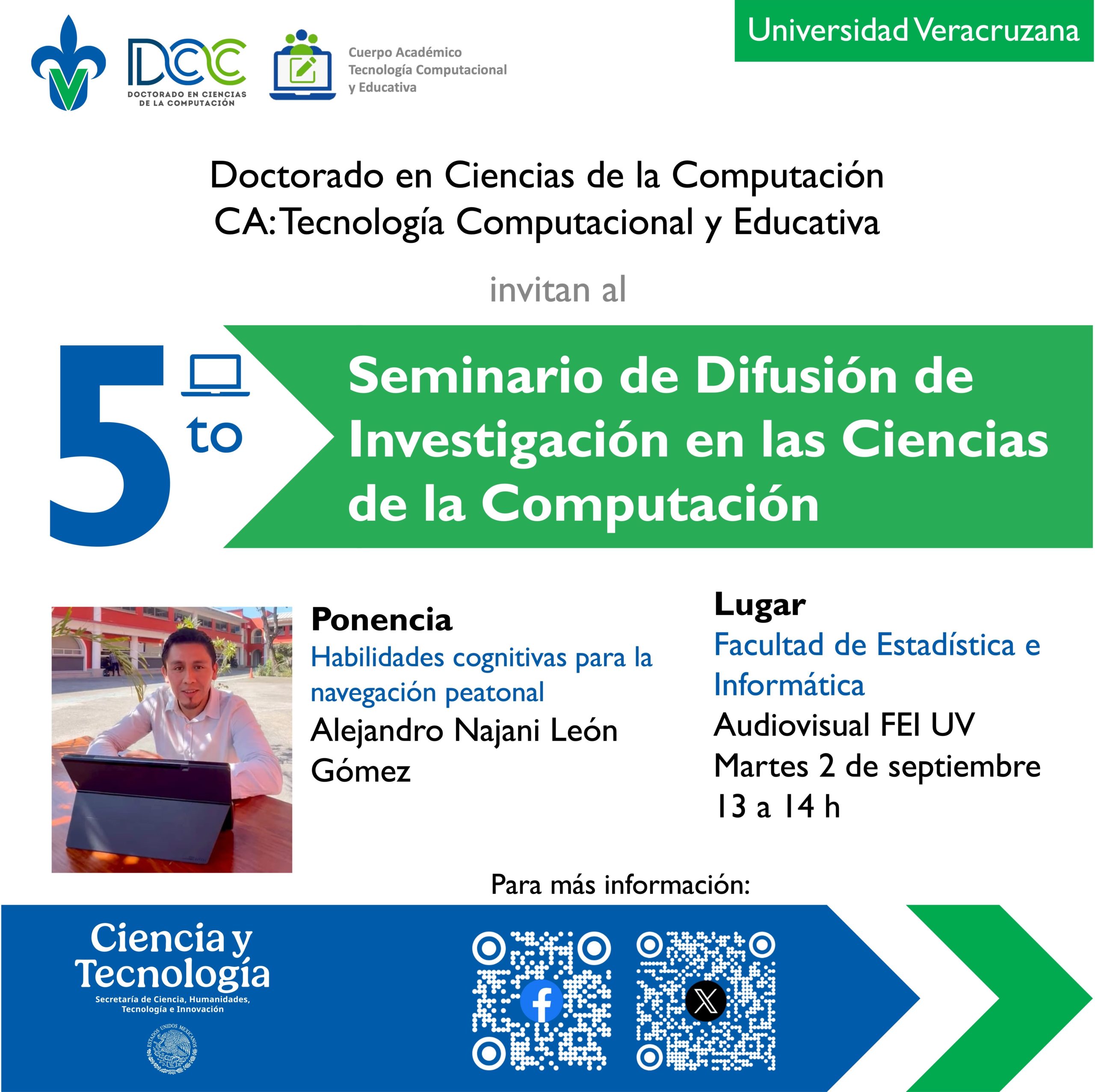 5to Seminario de Difusión de Investigación en Ciencias de la Computación Atenta invitación a toda la comunidad estudintil a asistir al: Primera ponencia a cargo del Mtro. Alejandro Nanaji León Gómez, martes 2 de septiembre, audivisual de la FEI-UV, 13:00 hrs